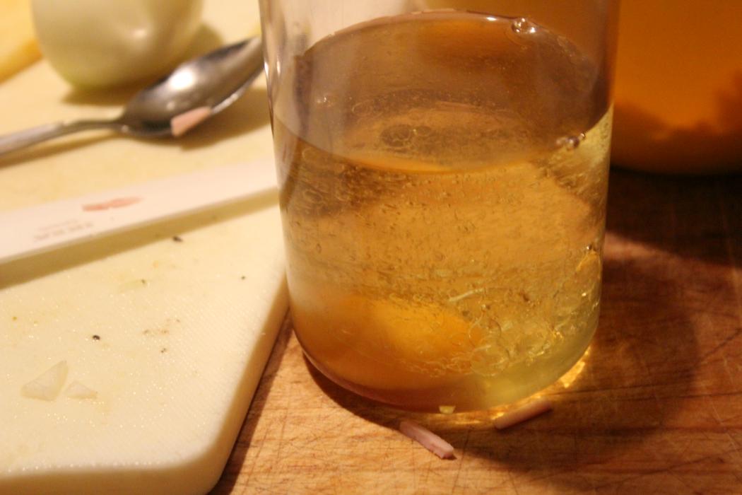 Jetzt kümmern wir uns noch um die Mayonnaise. Die ist beim gekauften Wurstsalat höchstwahrscheinlich die eigentliche Schwachstelle, weil das immer so ne total erschlagende Industriepampe ist, die saure Konservierungsmittel mit so einer fiesen süßsauren Note zu überdecken versucht. Wenn man die ein weniger schöner macht, ist das Meiste schon gewonnen.