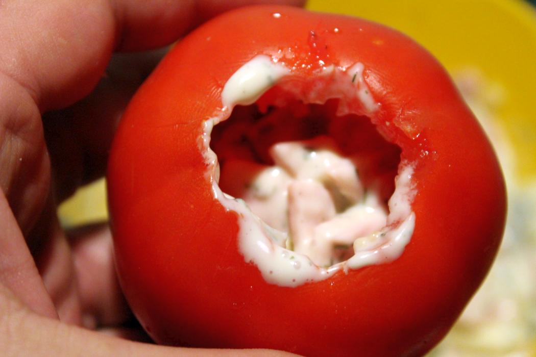 Anschließend die Tomate mit dem Fleischsalat randvoll befüllen