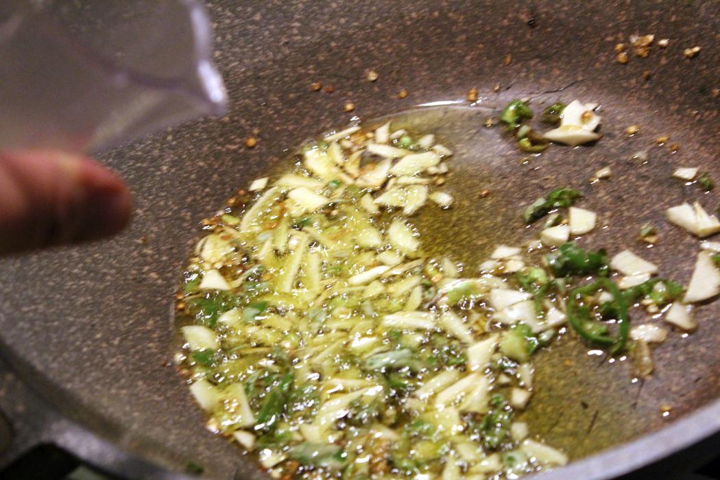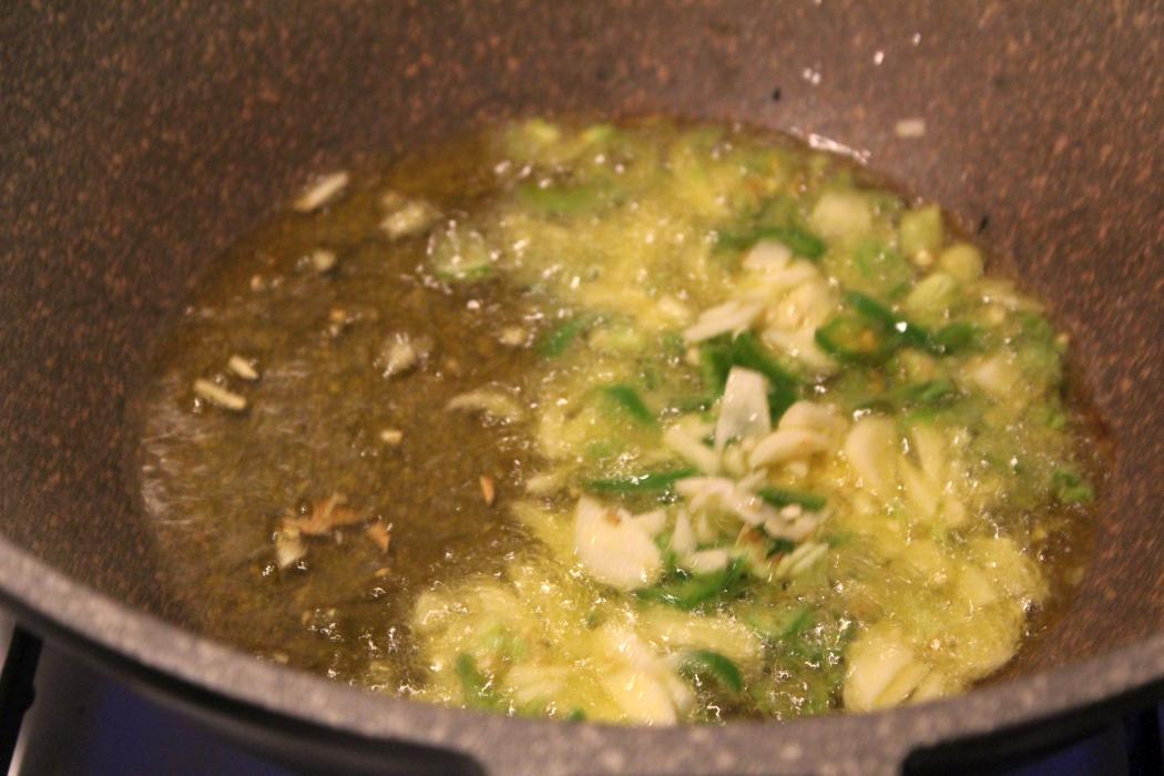 Peperoni und Knoblauch anschwitzen, bis sie glasig werden und leicht bräunen.