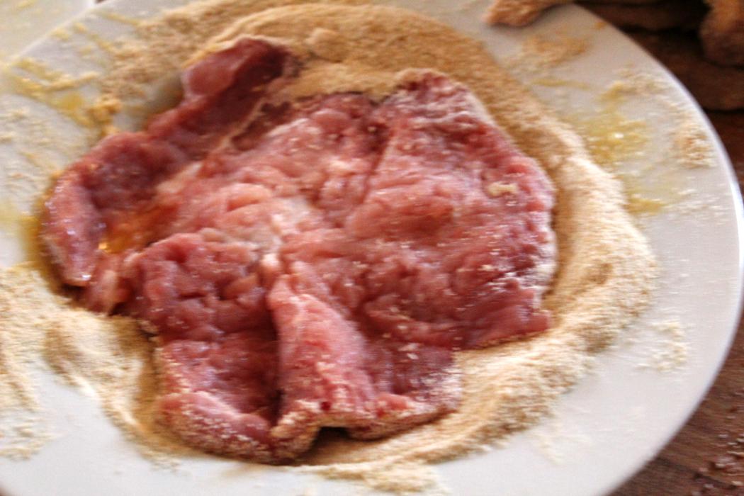 Jetzt noch schnell ins Paniermehl drücken und ein Augenmerk darauf legen, dass das Paniermehl überall gut am Fleisch hängen bleibt.