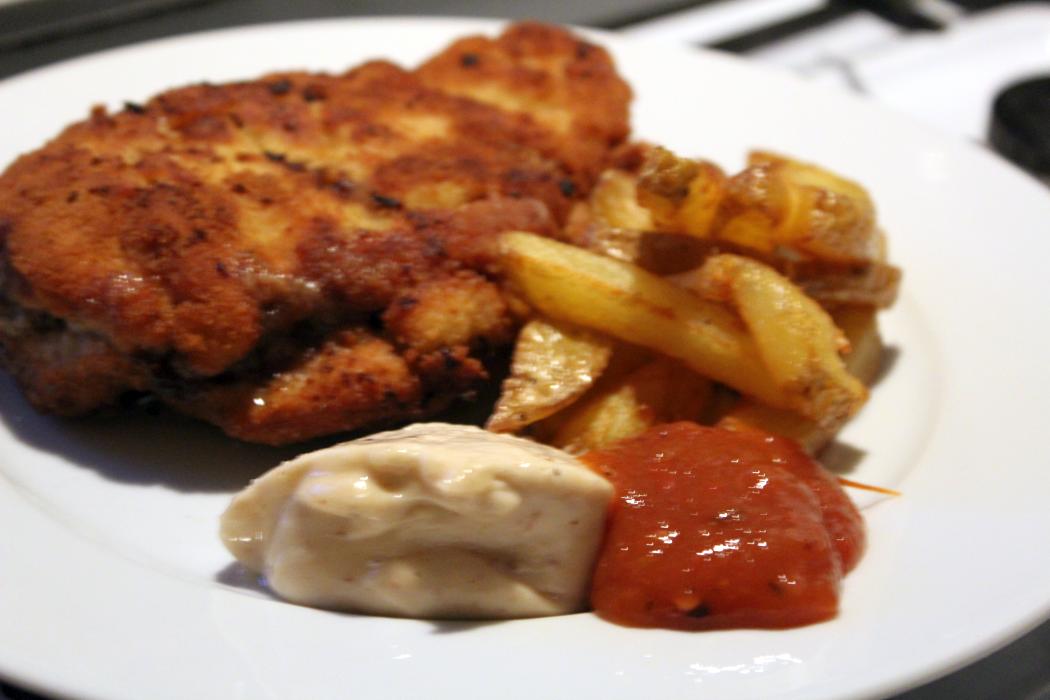 Total klasse. Das Pflaumenmus tut so, als wenn es schon immer als Schnitzelfüllung herhalten musste. Das läuft schön raus, schmeckt fruchtig, aber nicht zu süß und passt toll zur knusprigen Panierung. Zusammen mit der Pflaumenmayonnaise und dem Pflaumenketchup, ist das extrem rund und stimmig. Das sollte man unbedingt mal probiert haben, wenn man kein Schnitzeltaliban ist. Ich muss demnächst nach Rumänien und fahre vorsichtshalber über die Slowakei und mache gleich einen großen Bogen um Österreich. Sicher ist sicher ;-).
