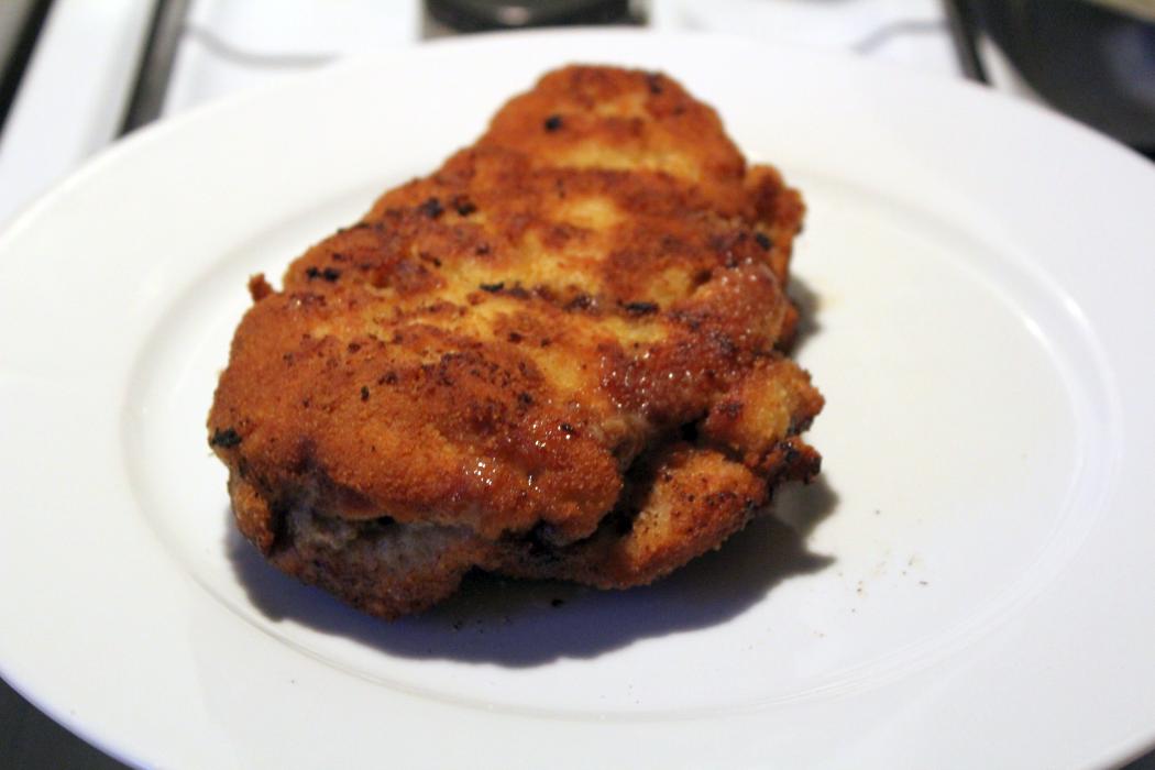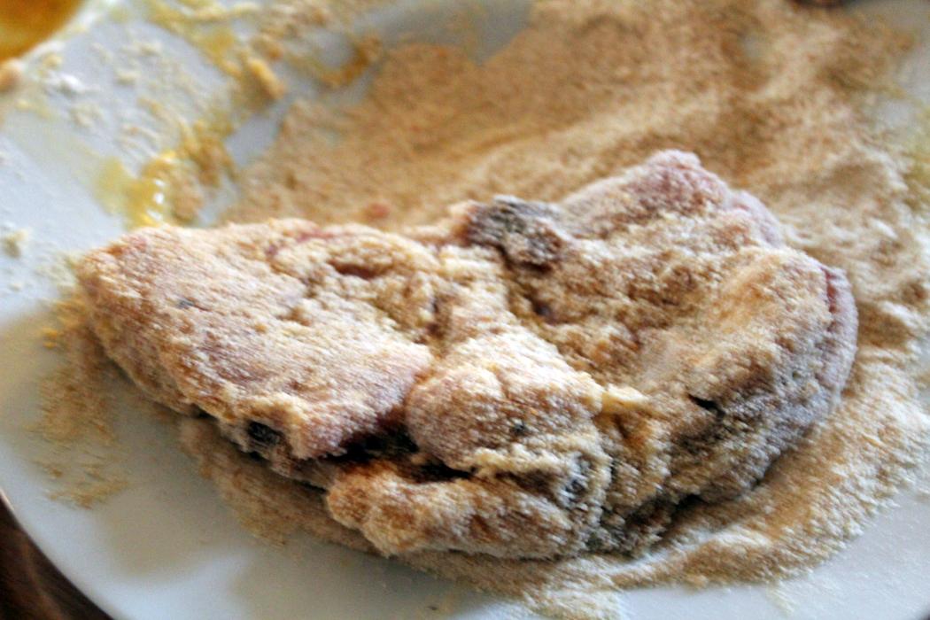 Da das Schnitzel gefüllt wird, muss man es nur von einer Seite panieren