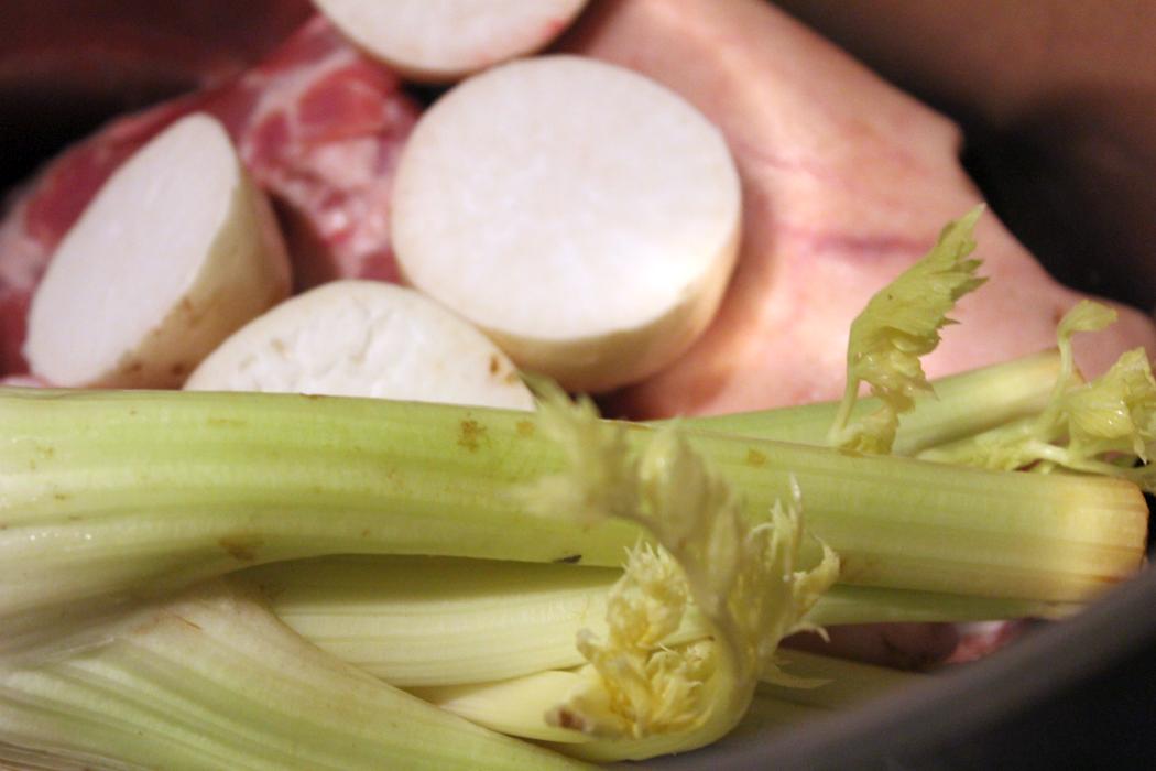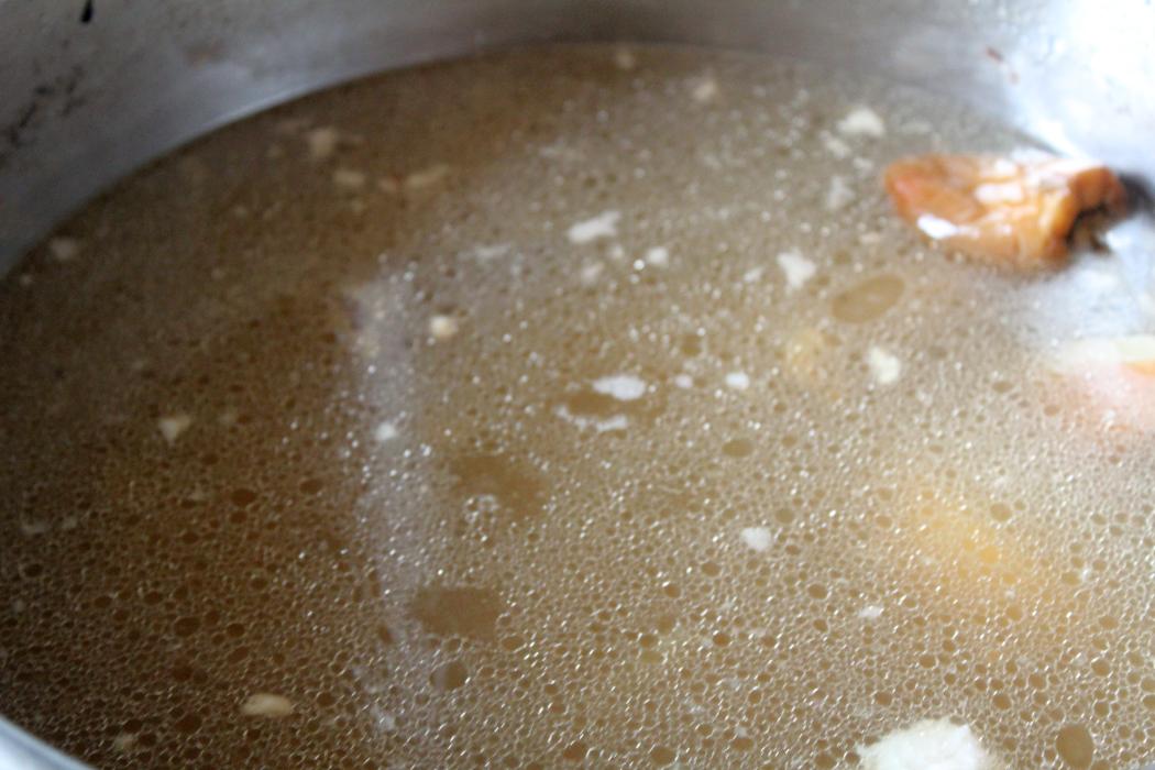 Ich habe noch Platz für 7 Liter Wasser, wenn alle Zutaten im Topf sind. Wasser für Brühe nimmt man immer kalt. Dann den Topf auf der größten Platte bei mittlerer Hitze mit Deckel auf den Herd stellen. Sobald die Brühe anfängt zu sprudeln, sofort von der größten Platte auf die kleinste Herdplatte umziehen und nur so hoch einstellen, dass die Suppe gerade so vor sich hin simmert, also nur so kleine Blasen wirft