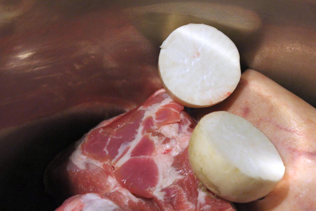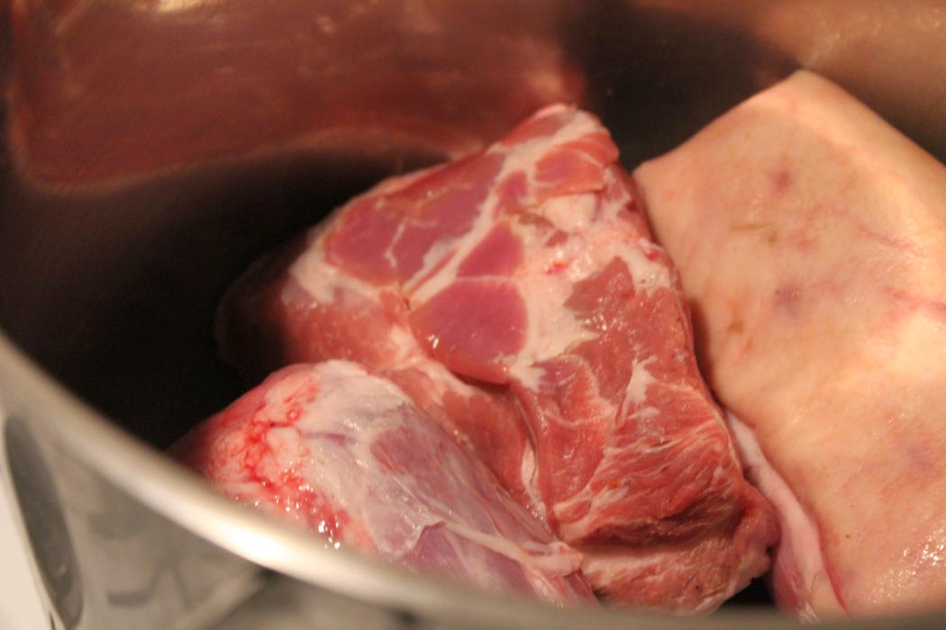 Als erstes meinen 20 Liter Topf mit den Zutaten bestücken Schweinshaxen und Nackenstück in den Topf legen.