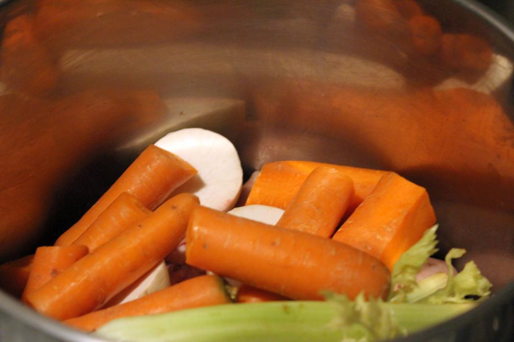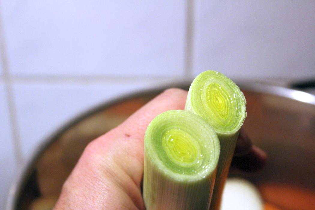 Mairüben müssen weg, also nur halbieren und in den Topf werfen. Im Prinzip ist egal, was Ihr noch an Gemüse reinwerft. Alles muss raus! Wenn Ihr noch Kohlrabi, Gemüseschalen von irgendwas habt, alles rein in den Topf. Das bringt alles Geschmack.
