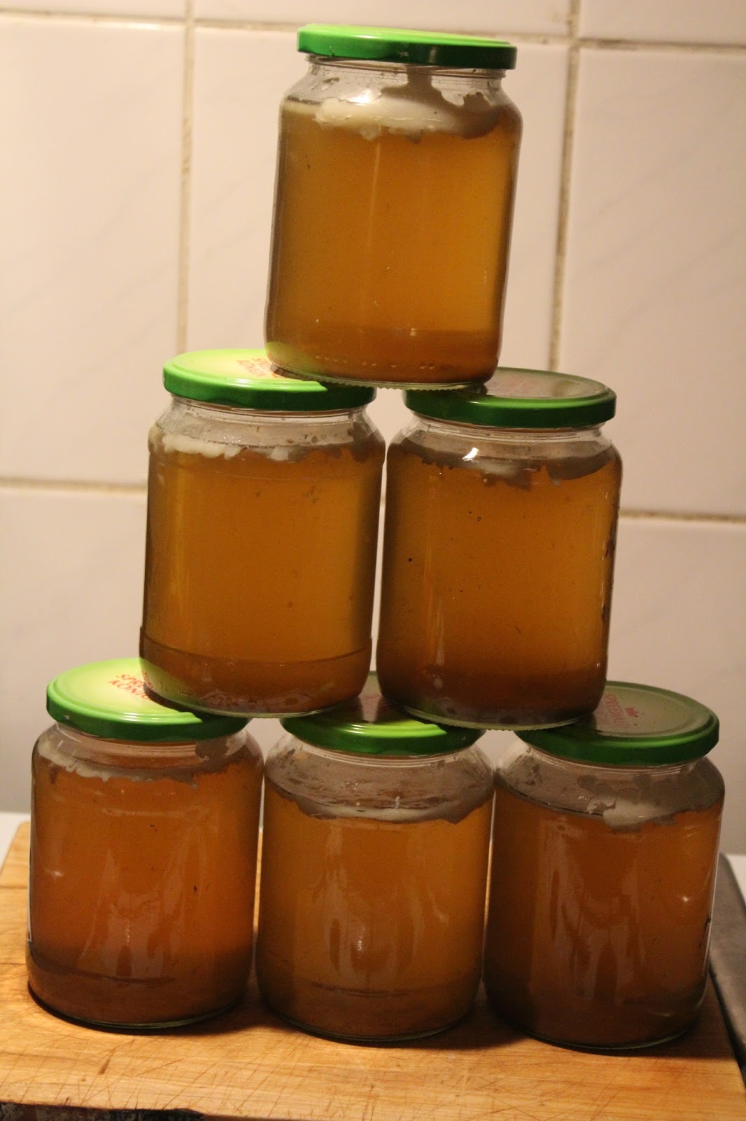 Wenn man die Brühe abkühlen lässt und dann erst in Gläser abfüllt, muss man sie hinterher im Topf, oder im Backofen einkochen, damit die Gläser ein Vakuum ziehen. Ich habe die Brühe wie gesagt, auf zwei Tage verteilt eingekocht und dann heiß in Gläser abgefüllt, einfach fest zugedreht, 20 Minuten auf den Kopf gedreht und dann richtig herum abkühlen lassen. Die Gläser sind alle so dicht, wie die Bank von England. Das erzähle ich Euch gerade viel zu früh, denn eigentlich ist die Brühe bildlich gerade noch im Topf.