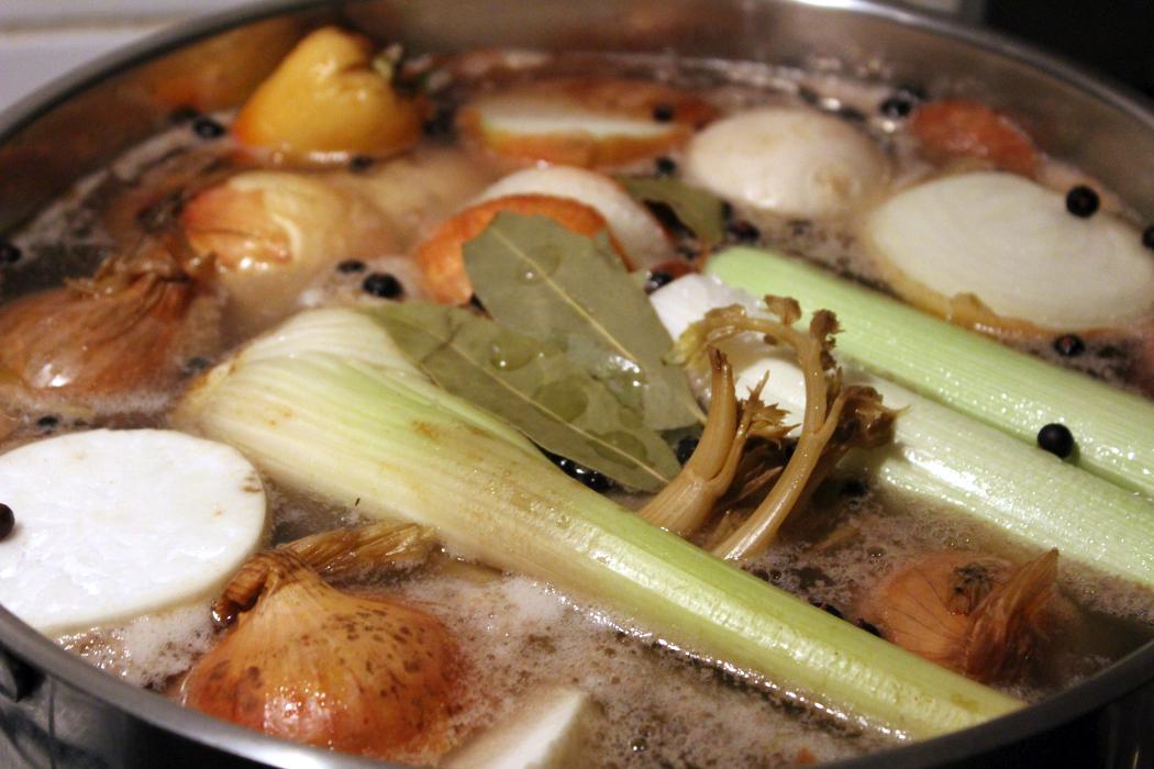 5 Zwiebeln, halbiert mit Schale (gut für die Farbe der Brühe)