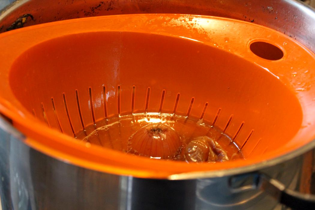 Die Brühe durch ein Sieb in eine Schüssel abkippen. Dann trennt man die Flüssigkeit von den Feststoffen.