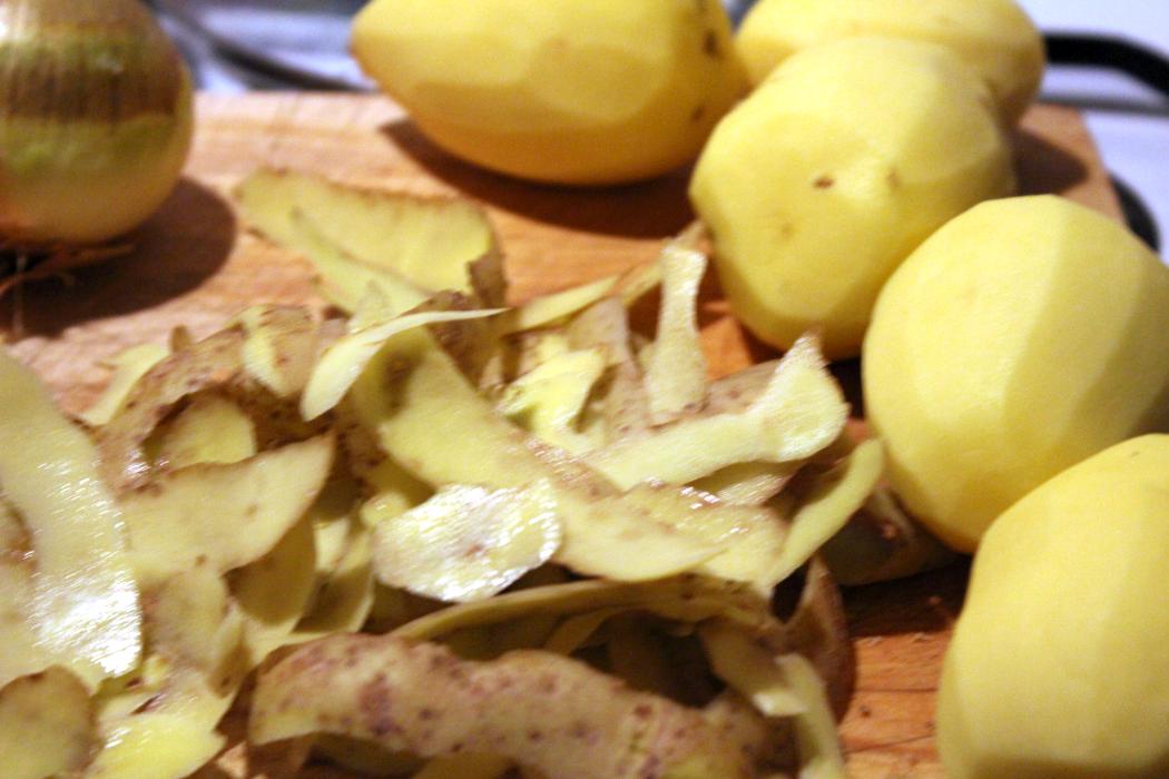 Kartoffeln in Scheiben schneiden. Ich nehme hier übrigens rohe Kartoffeln und rechne für die 20 Minuten, bis sie innen weich und außen kross sind.