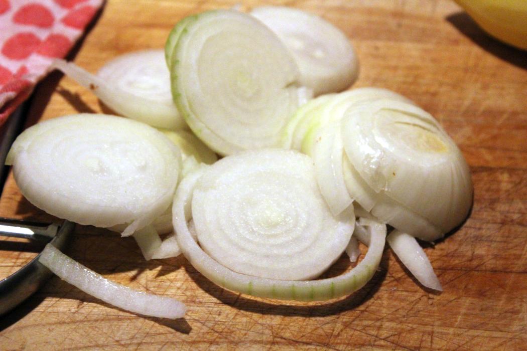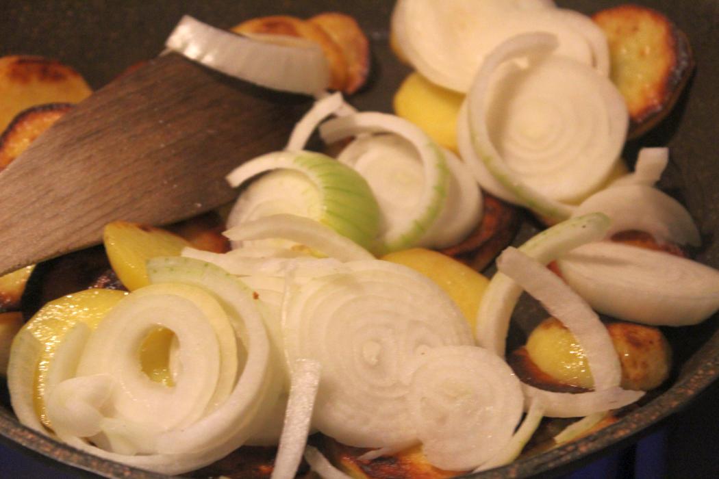 Nach zehn Minuten kommen die Zwiebeln in die Pfanne. Ist vielleicht nur meine Marotte, aber ich habe immer das Gefühl, dass die Zwiebeln zu schnell schwarz werden, wenn man sie über die komplette Garzeit der Kartoffeln mit in der Pfanne hat.