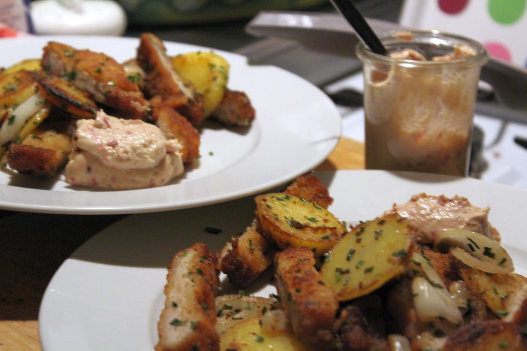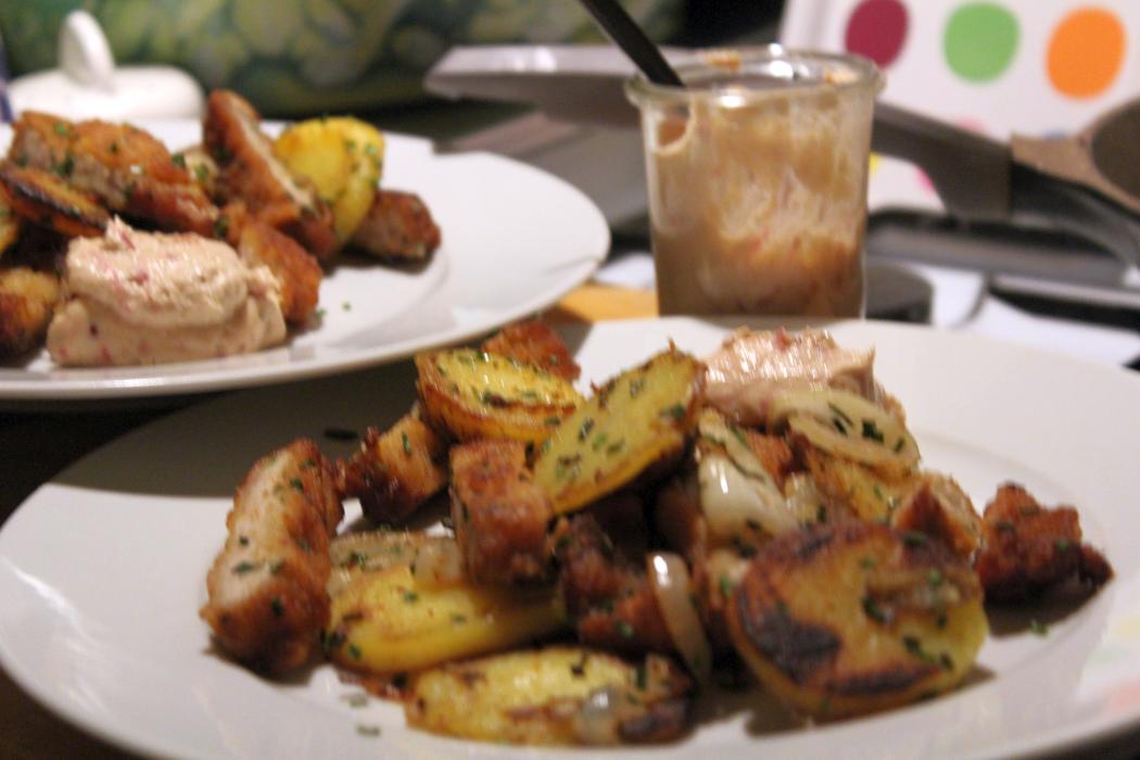 Das ist echt lecker! Schöne krosse Bratkartoffeln mit Zwiebeln, leckere Schnitzelstreifen und dazu noch der innovative Pflaumensenf. Natürlich gewinnt man damit keinen Stern von Gastrokritikern, aber das ist anständiges Essen, wenn man Zeit und Hunger in Einklang bringen möchte.