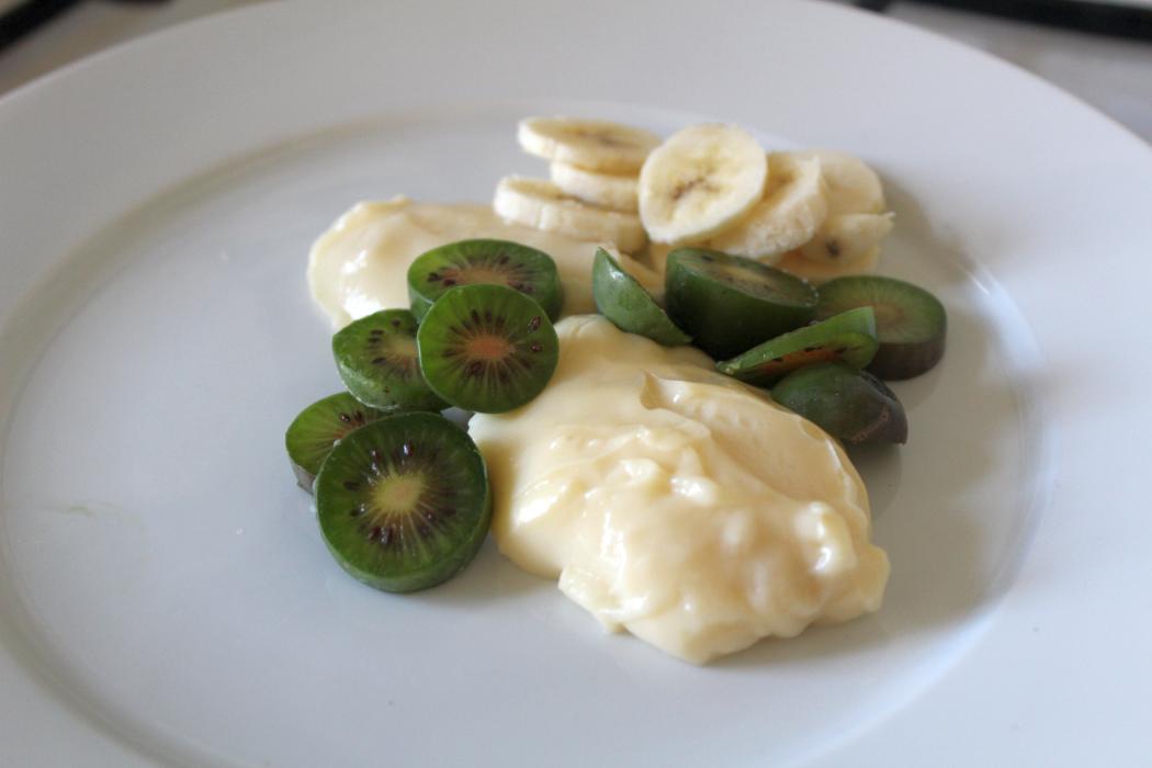 Das Rezept haben mir meine Zutaten eingeflüstert. Samstag nach zwanzig Uhr war ich mit den Kindern noch bei Kaufland einkaufen und dort gab es Kiwibeeren 70 % unter Preis. Da habe ich die einfach mitgenommen, ohne eine Idee zu haben, was man damit anstellt. Was soll man mit Kiwibeeren machen? Keine Ahnung! In der Nacht von Samstag auf Sonntag kam mir dann der rettende Einfall, Pudding kochen und die Kiwibeeren als Fruchtdeko benutzen.