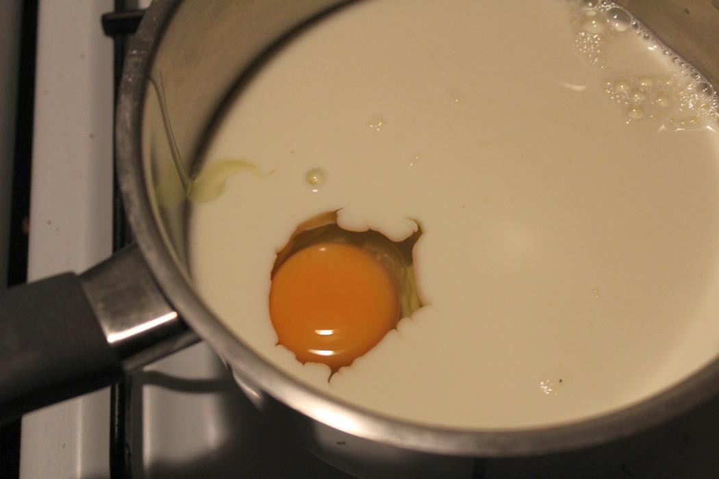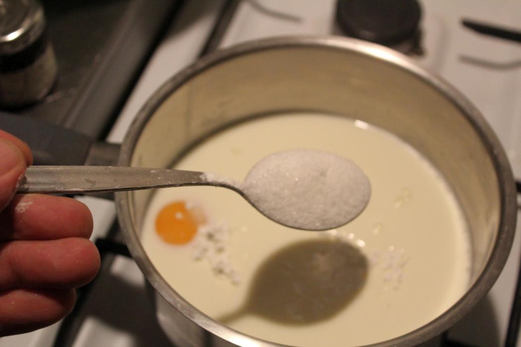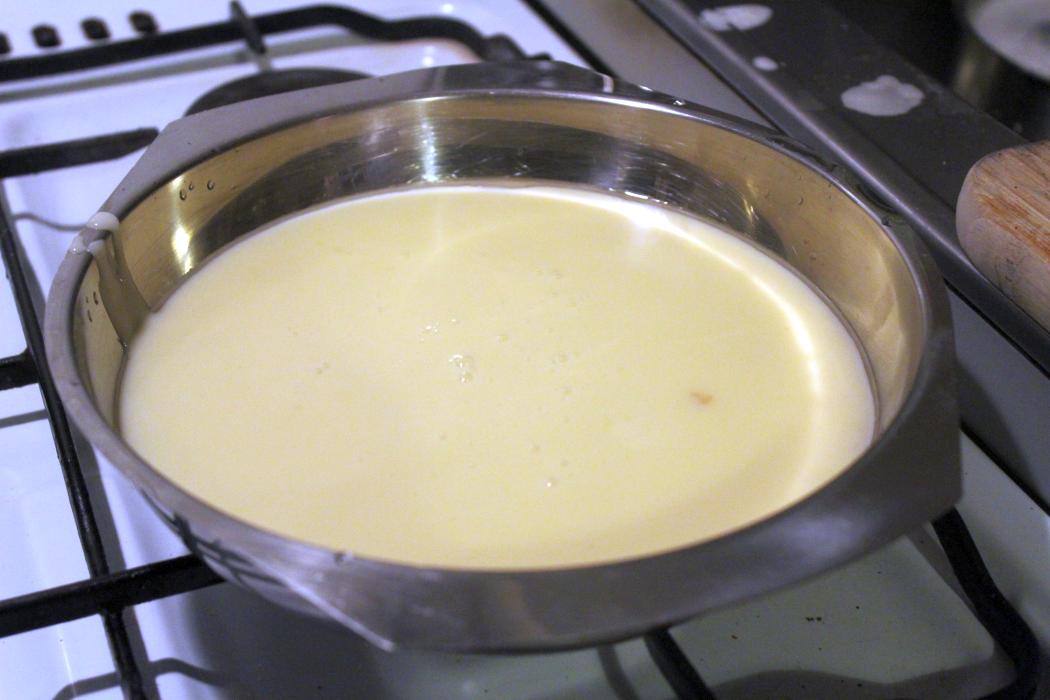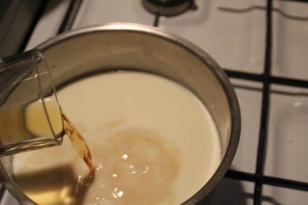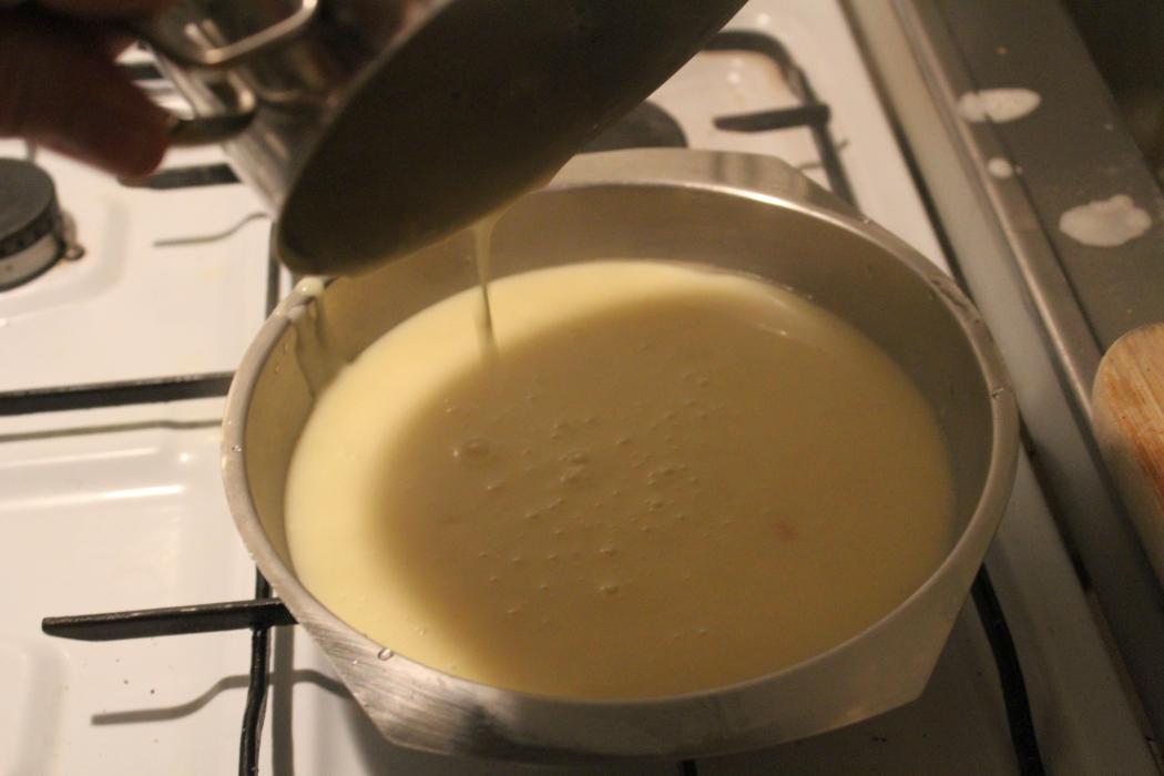 Wenn der Pudding kocht, einen Teelöffel Natron in den Pudding geben.