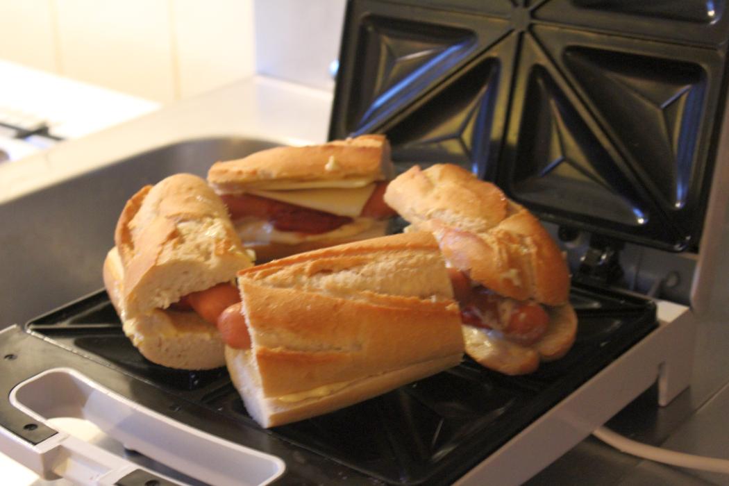 Das ist jetzt der eigentlich schwierige Teil des Gerichts, weil der Sandwichmaker eigentlich auf Toastscheiben ausgelegt ist, die Baguettes so weit mit dem Deckel zusammen zu pressen, dass die Klappe geschlossen werden kann. Da fühlt man sich wie an der Unterarmpresse im Sportstudio.