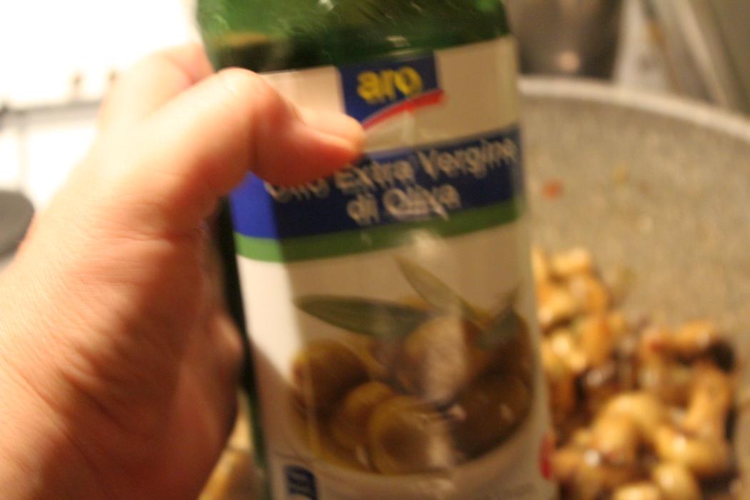 Jetzt noch einen ordentlichen Schuss Öl, damit die Champignons schwimmen