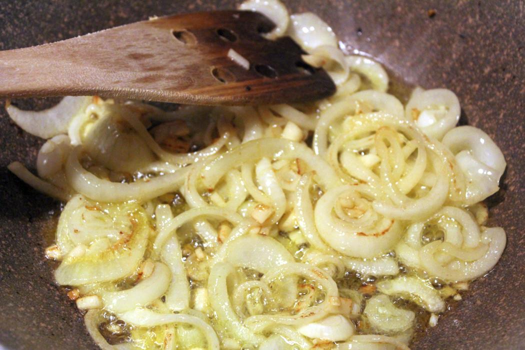 Knoblauch und Zwiebeln glasig anbraten, noch nicht würzen.