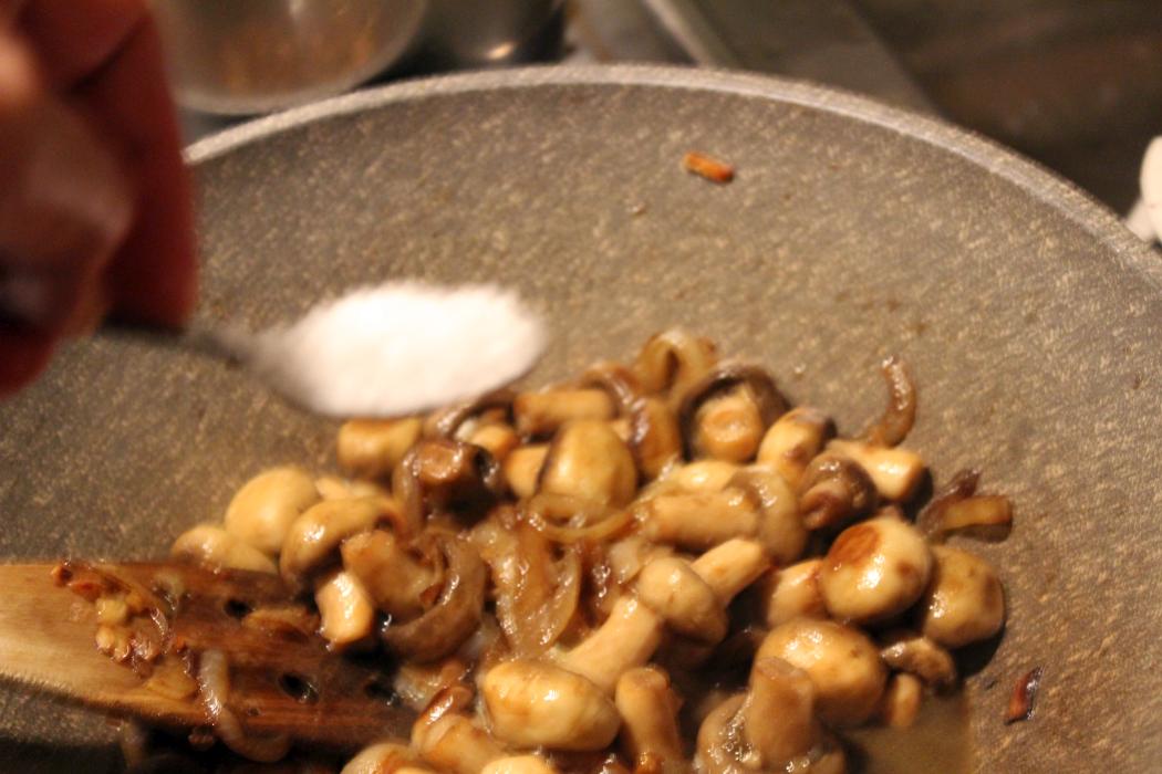 Zeitgleich die Champignons in die Pfanne werfen. Die schrumpfen noch so stark zusammen, dass ich daran gar nicht rumschneide und die einfach so lasse, wie sie sind. Klar, wenn da Sand dran ist, bürstet man den weg.