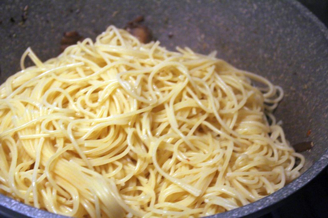 Vorsichtig und sorgfältig die Nudeln unter die Pilze heben.