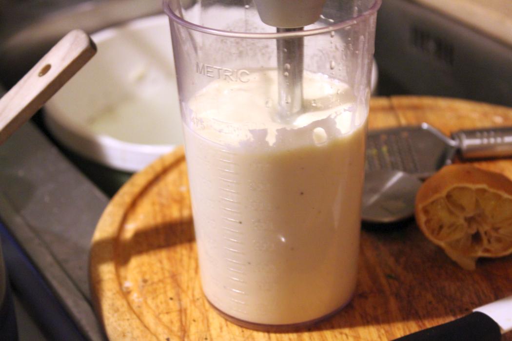 Als Soßenbeilage über das hinaus, was beim Schmoren entsteht, mache ich eine Mayonnaise. Man kann auch eine Aioli machen, aber mit Kindern am Tisch ist die schnell mal zu heftig, mit dem ganzen Knoblauch.