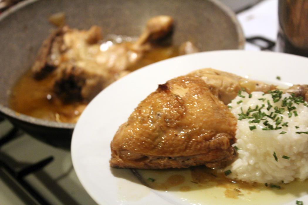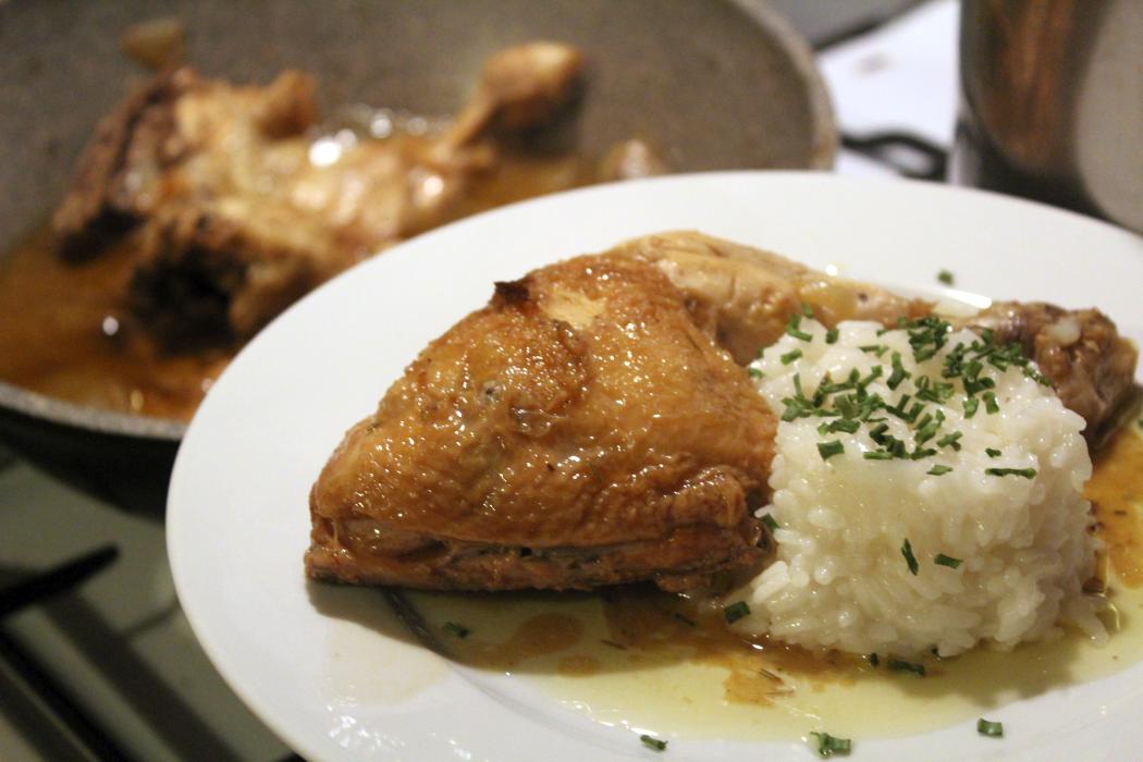 Das ist wirklich klasse, total zartes Fleisch, das von alleine vom Knochen fällt, kräftige Schmorflüssigkeit, salzig mit feiner Säure der Limette. Das harmoniert auch sehr gut mit dem Reis und der Mayonnaise und fühlt sich an wie am Mittelmeer. Geschmortes Huhn macht man natürlich nicht für knusprige Haut, sondern für den guten Geschmack und das zarte Fleisch.