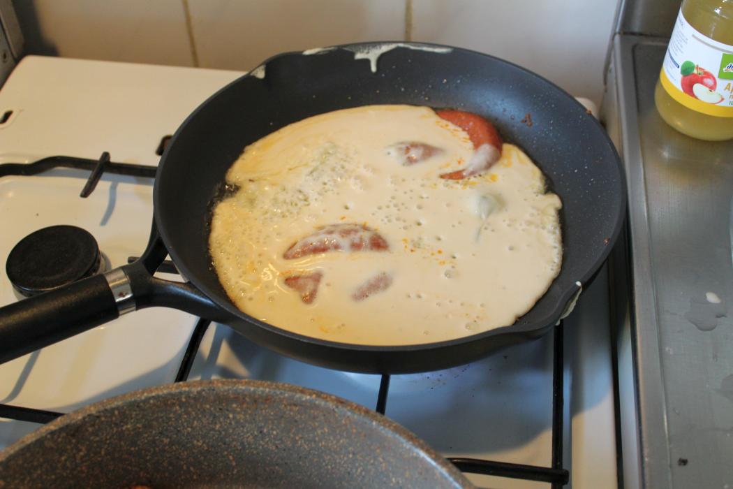 Pfannkuchenteig mit einer Schöpfkelle in die Pfanne geben.