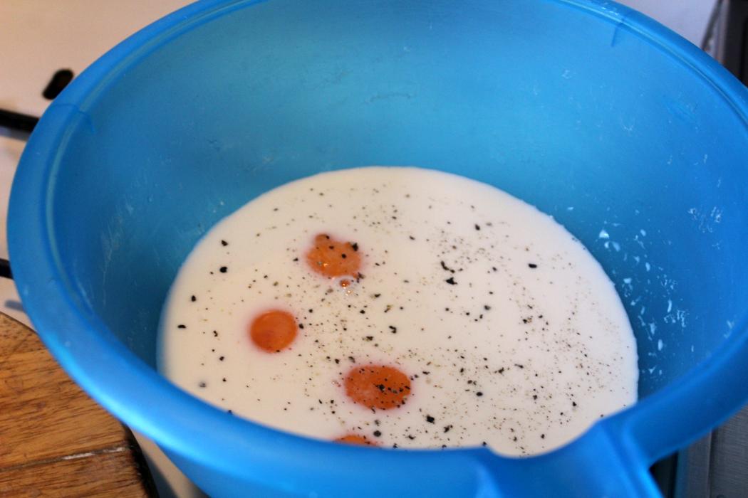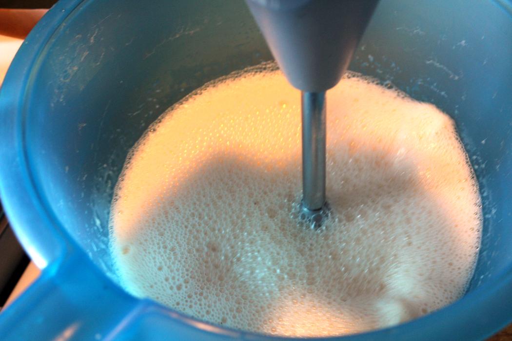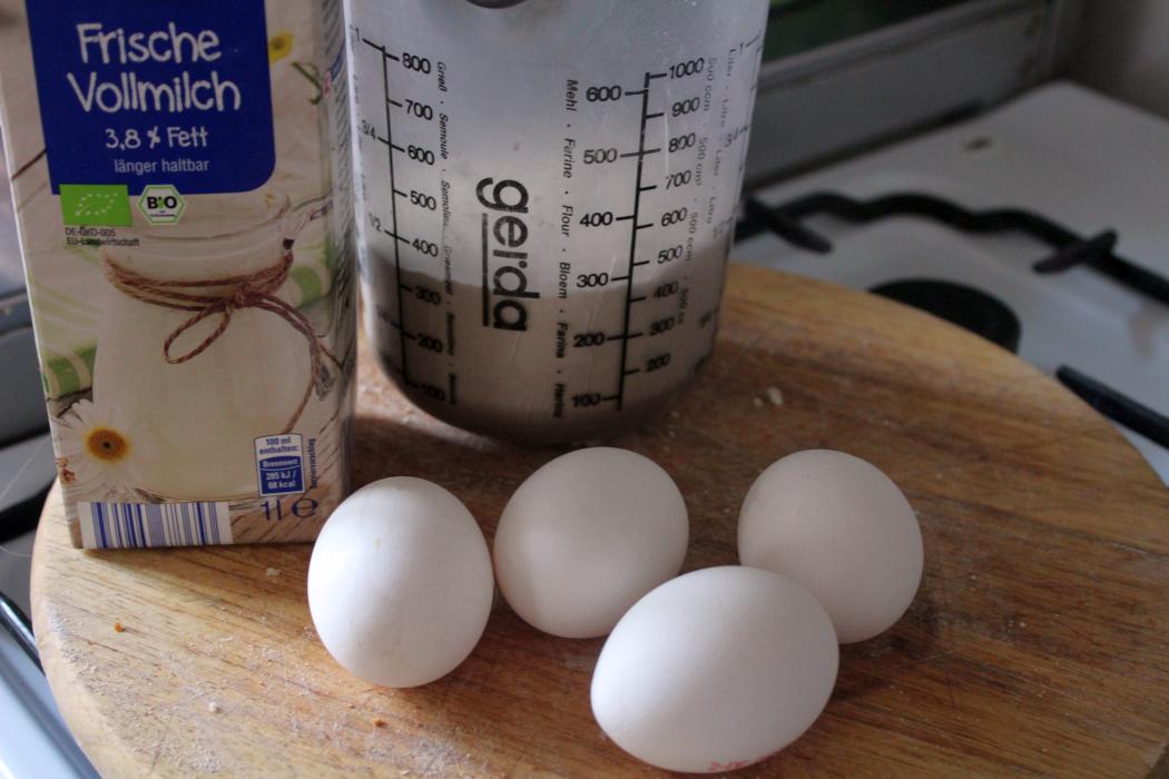 Flüssigkeit mit den Eiern vermischen und dann nach und nach das Mehl einstreuen, während man die Masse mit dem Zauberstab, oder Handrührer aufschlägt.