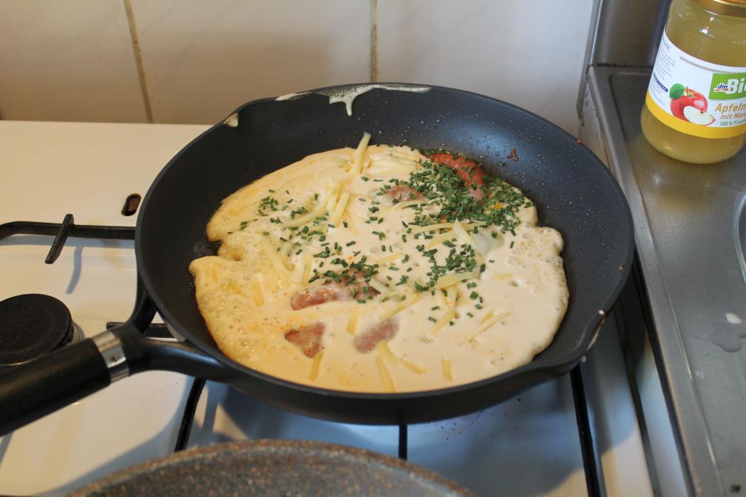 Schnittlauch einstreuen und den Pfannkuchen nach 1,5 bis 2 Minuten wenden