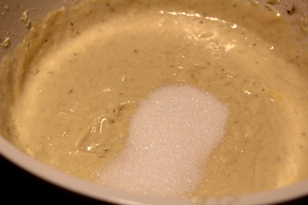 Die restlichen 60 Gramm Zucker in den Teig geben. Es kommt immer darauf an, wie süß die Bananen sind, aber die müssen nicht zwanghaft sein und damit wird es dann so süß wie in südlichen Ländern, also genau mein Geschmack.