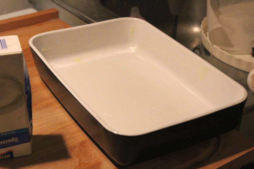 Ihr könnt eine 24 cm Springform, oder eine Kastenform. Ich habe eine Steingutform verwendet. Die buttere ich vorher aus, damit das Backpapier besser an den Rändern der Form haftet.