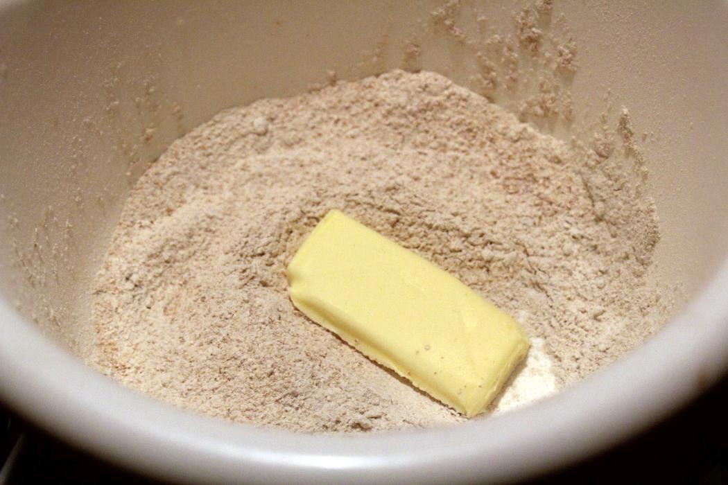Die Zutaten mit der Butter verrühren, da passiert aber noch nicht viel bei 25 Gramm Butter auf 100 Gramm Mehl