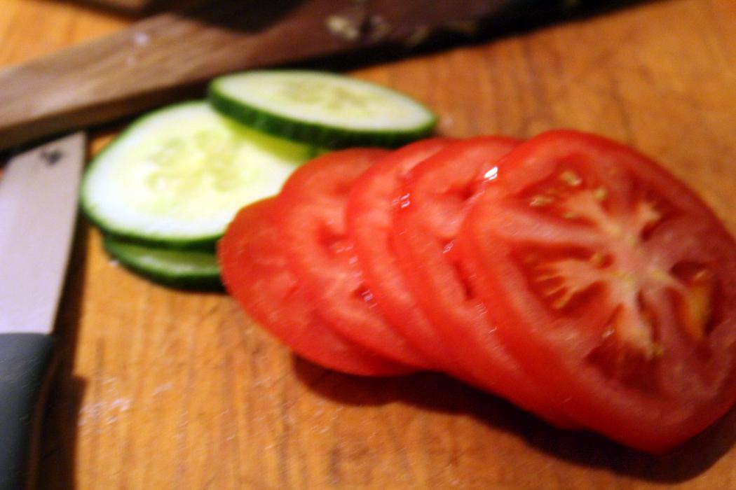 Salatgurkenscheiben und dünne Tomatenscheiben schneiden