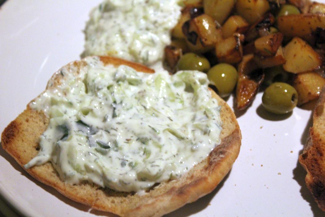 Getoastetes Pitabrötchen mit Zaziki bestreichen