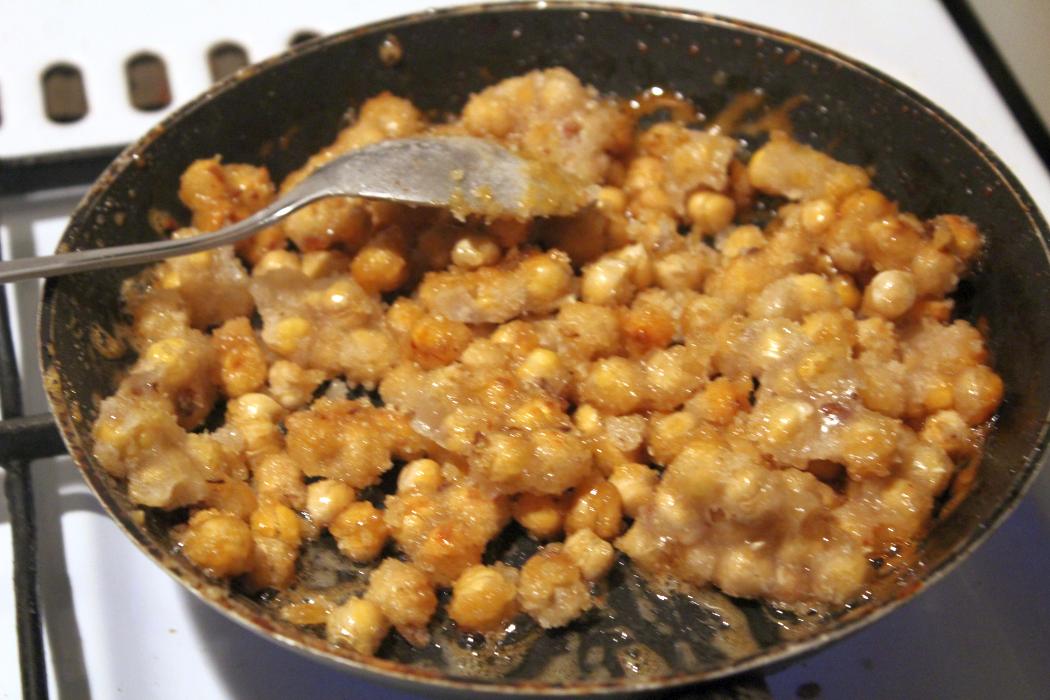 So soll es sein, also Herd ausstellen und raus aus der Pfanne, mit den gebrannten Kichererbsen,