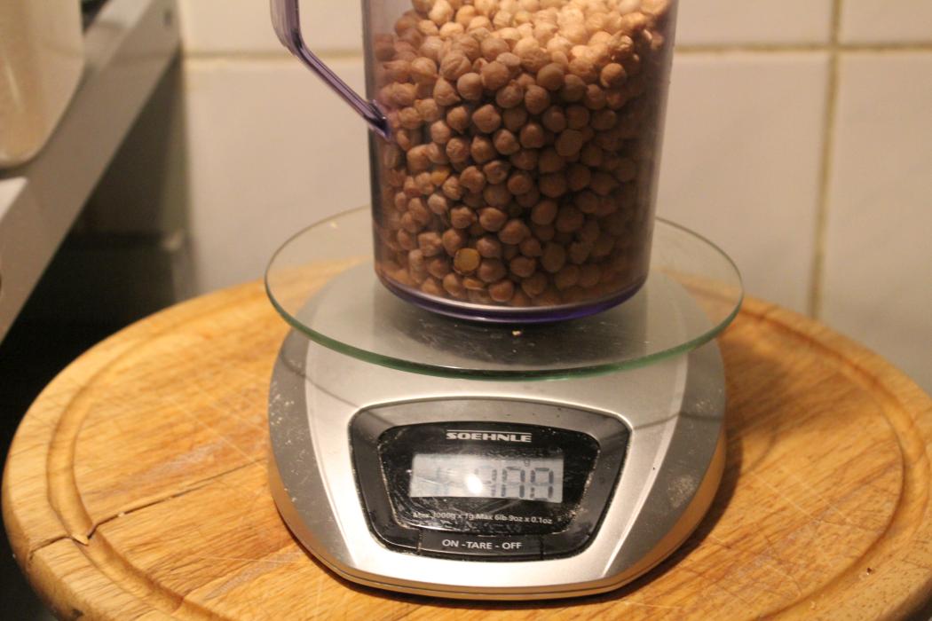 natürlilch kannst du auch kichererbsen aus der dose verwenden, da musst du auf die einwaage achten. mein ausgangsgewicht sind trockene kichererbsen. die verdoppeln sich ja im wasser.