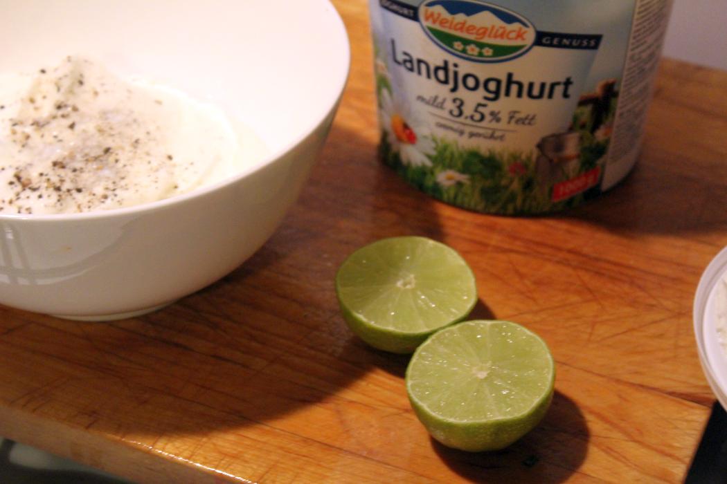 1/2 Limette darüber auspressen, Salz, Pfeffer, Zucker zum Würzen, ein bisschen Grünkraut für die Farbe und den runden Geschmack. Ich verwende gewohnheitsmäßig Schnittlauch.