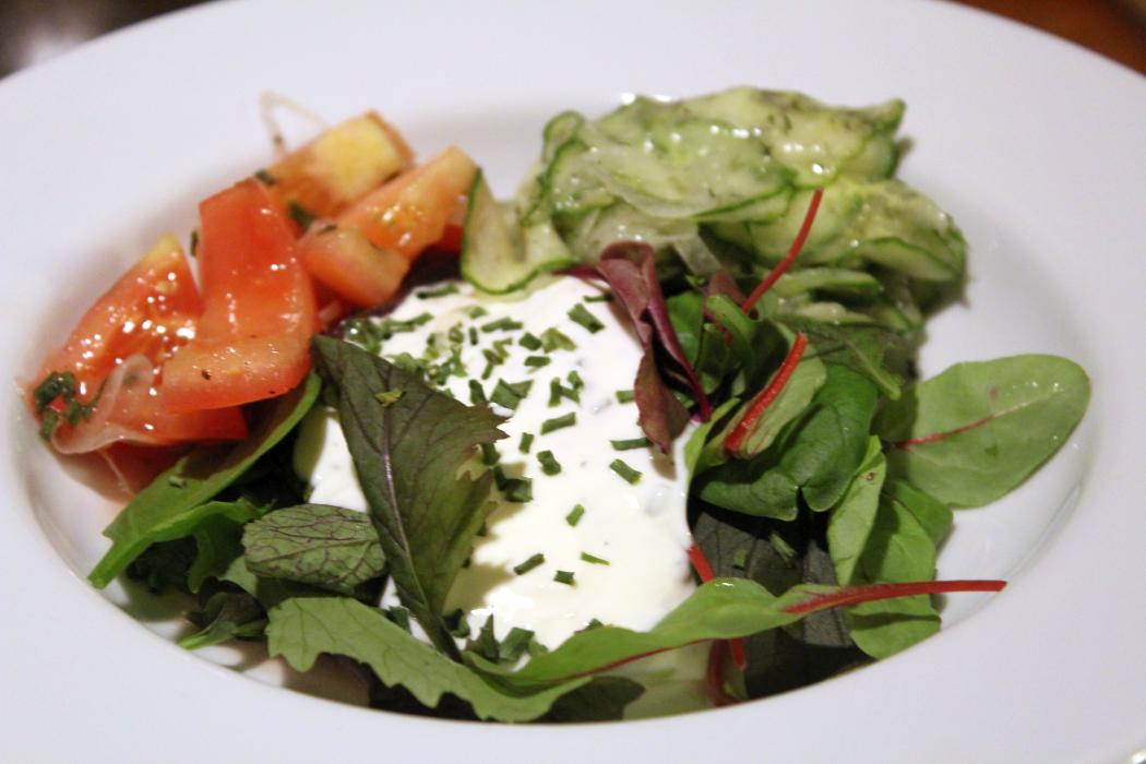 Und hier ist er jetzt, ein ganz schneller gemischter Salat mit drei einfachen Dressings, die jeweils das beste aus den einzelnen Komponenten rausholen. Tomaten mit Rotweinessig, Gurken mit Weißweinessig und Blattsalat, bzw. Wildkräutersalat mit Sahnejoghurtdressing