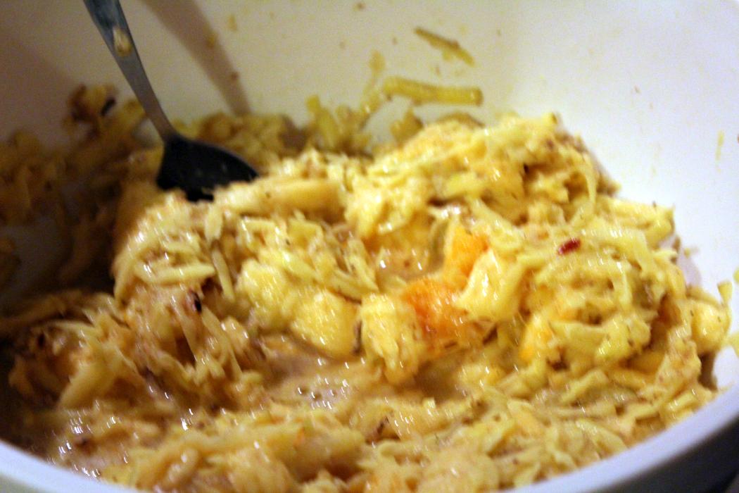 Hier ist der Inhalt des Kürbis. Meine Frau hat sich noch eine Kürbissuppe daraus gekocht (mir wird bei dem Gedanken schon ganze anders), ich habe ein Kilo Kürbisfleisch davon abgenommen, um die Puffer im Verhältnis halb Kürbis, halb Kartoffel auszubacken