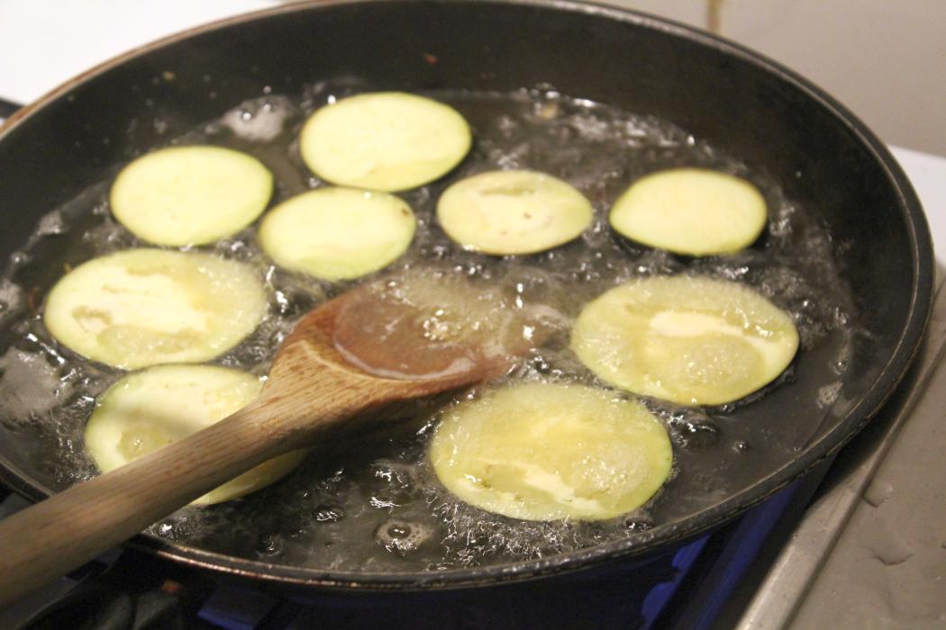 Fett in der Pfanne so hoch erhitzen, bis es am Holzlöffel sprudelt. Der Ölstand in der Pfanne muss so hoch sein, dass die Auberginen beim Ausbacken schwimmen und nach einmaligem Wenden von beiden Seiten gleichmäßig braun sind. Herd läuft volle Pulle, auf größter Platte.