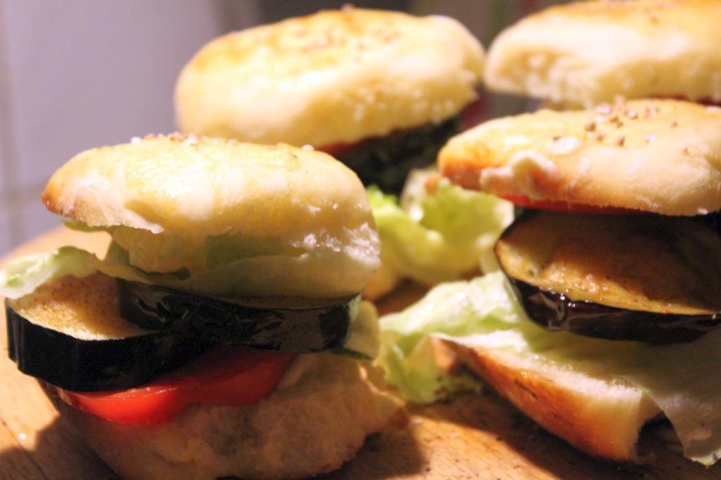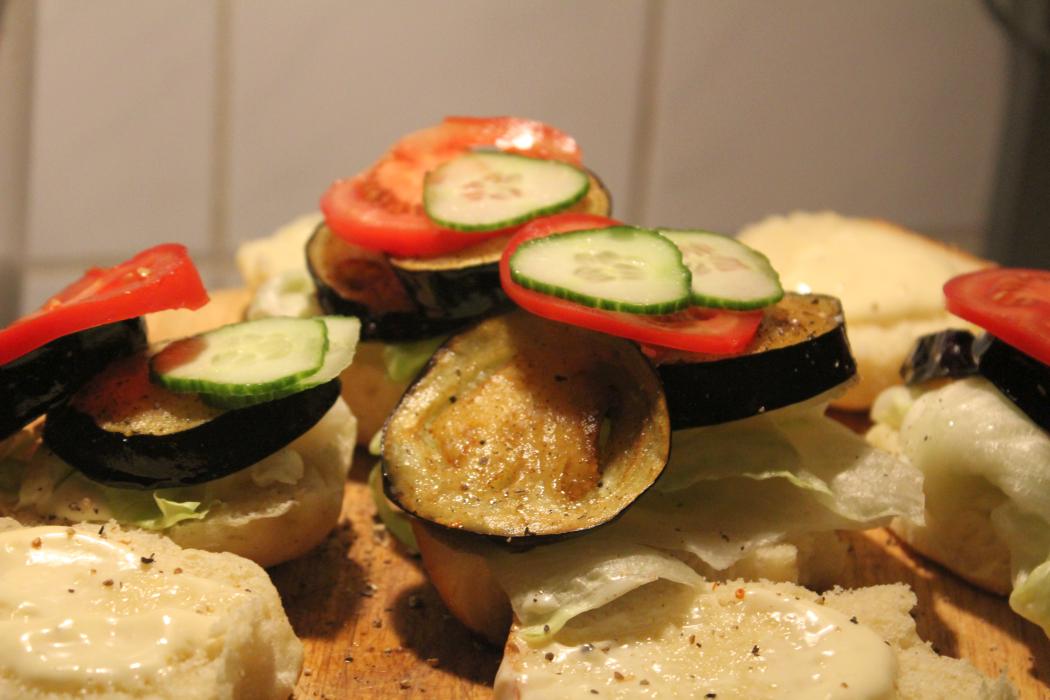 Saugeil, frische selbst gebackene Buns, mit knackigem Gemüse und leckeren gebratenen Auberginenscheiben. Da habe ich in Restaurants nur schlechtere Burger mit Fleisch gegessen. Das ist echt der Hammer. Super im Biss, echt leckerer Kontrast zwischen dem gebratenen und dem frischem Gemüse und dann noch die Mayonnaise, die das alles harmonisch miteinander vereint.