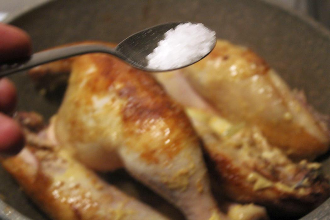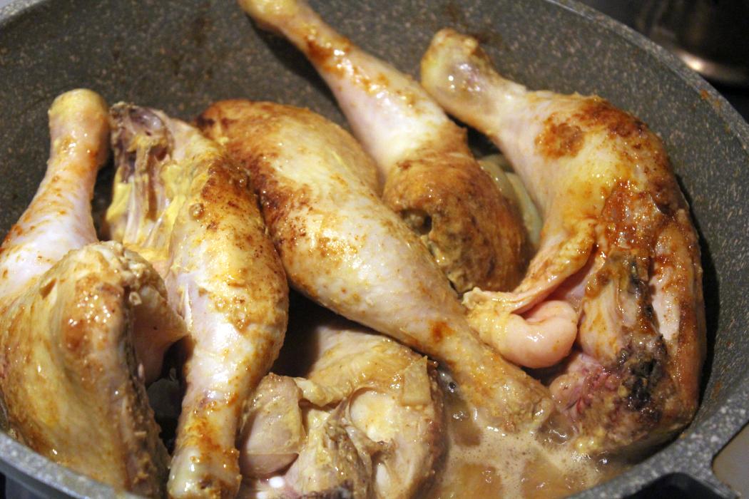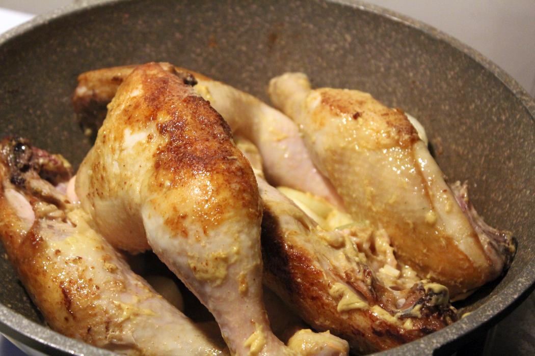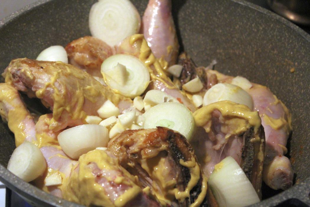 Senf zu den Hähnchenkeulen in die Pfanne geben.