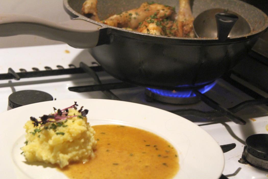 Schmoren ist für mich die einfachste Zubereitungsmethode. Ich lege keinen gesteigerten Wert auf eine krosse Haut, sondern für mich ist wichtig, dass das Fleich möglichst zart wird. Die optimale Kerntemperatur bei Huhn sind 82 Grad. Dann fällt das Fleisch von den Knochen und ist total zart, wie man sich das wünscht.
