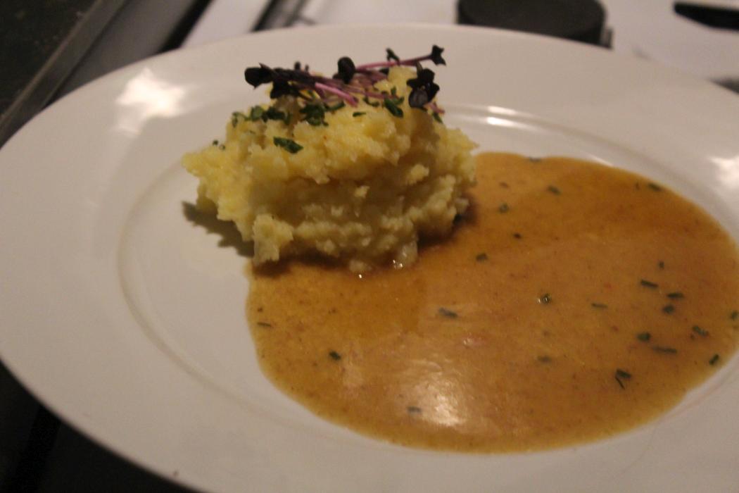 Einen Soßenspiegel auf dem Teller ausbringen, Kartoffelpüree dazu dekorieren.