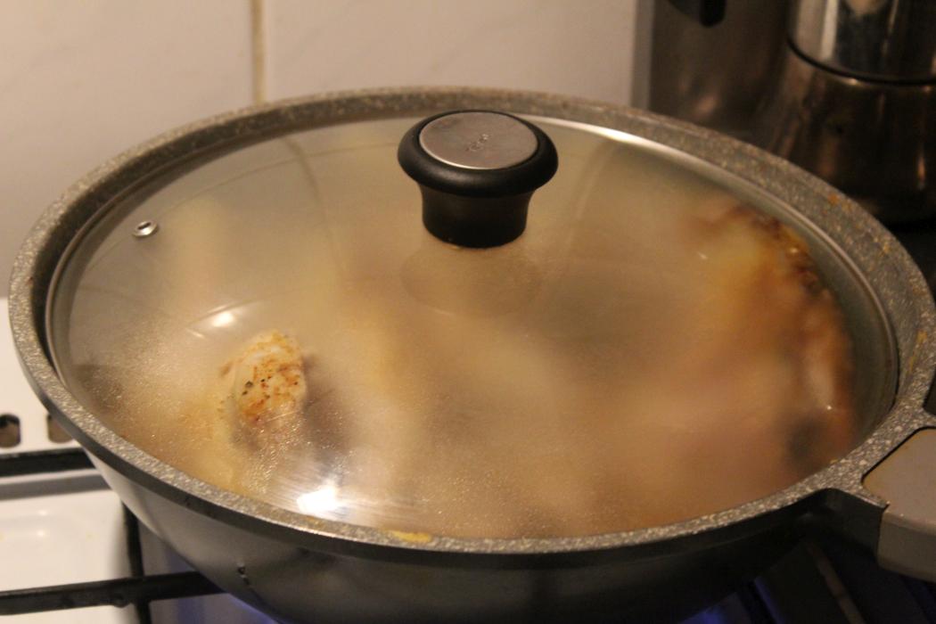 Wenn das Fleisch gut angebraten ist, 0,3 Liter Brühe in den Wok geben.
