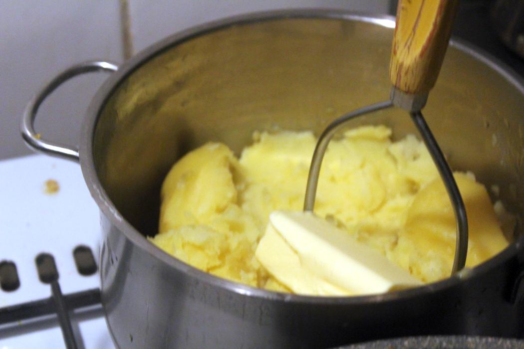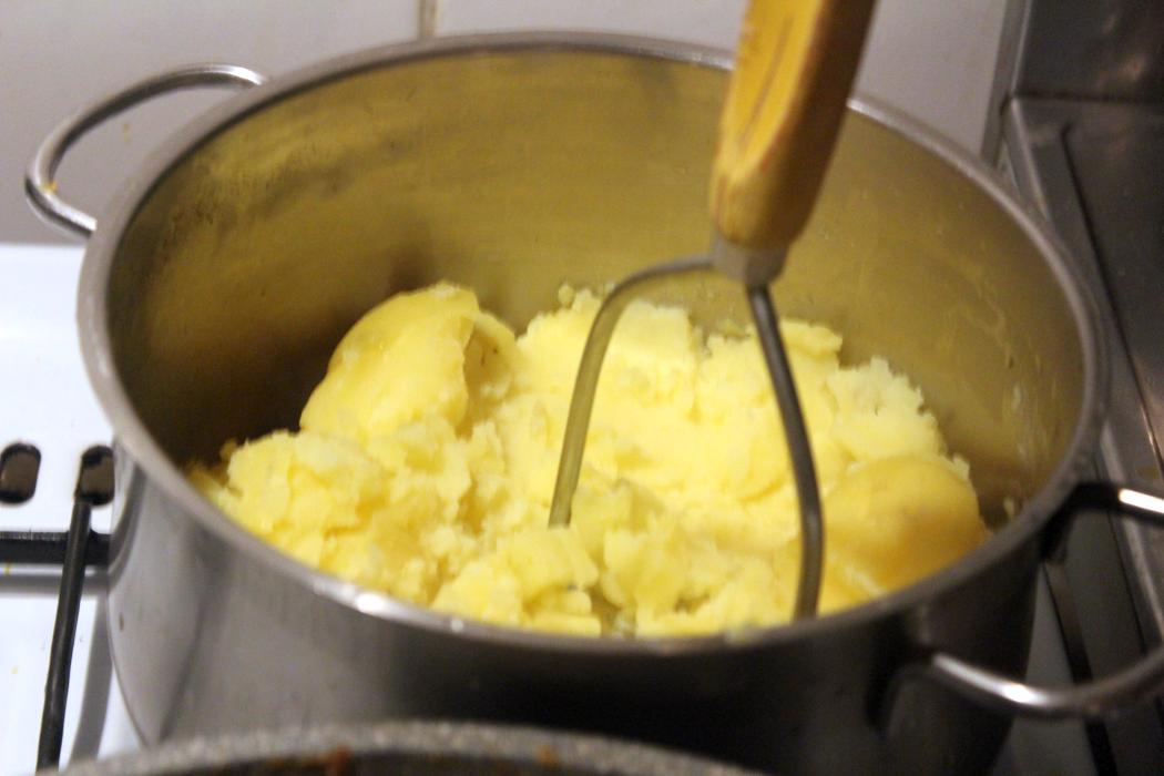 In der Zeit machen wir das Kartoffelpüree. Kartoffeln stampfen.