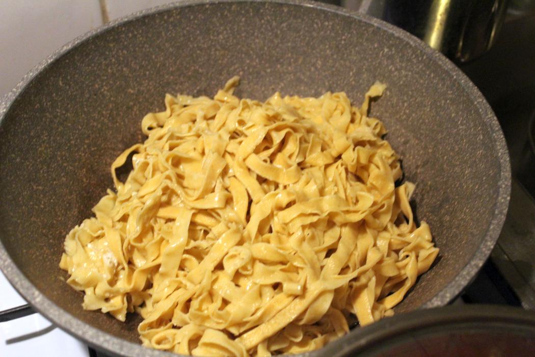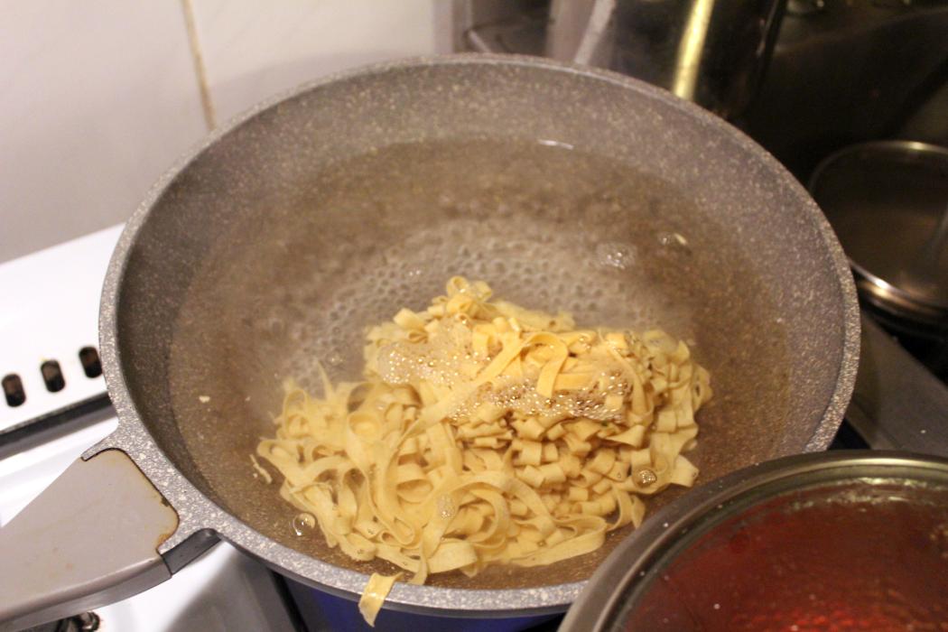 Ich habe den Nudelteig schon am Vortag gemacht und aufgeteilt. Deswegen lege ich an diesem Tag mehr Wert auf die Soße, weil ich durch den über Nacht im Kühlschrank aufbewahrten Nudelteig ein bisschen mehr Zeit dafür verwenden kann.