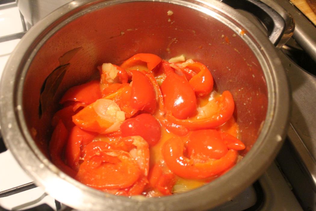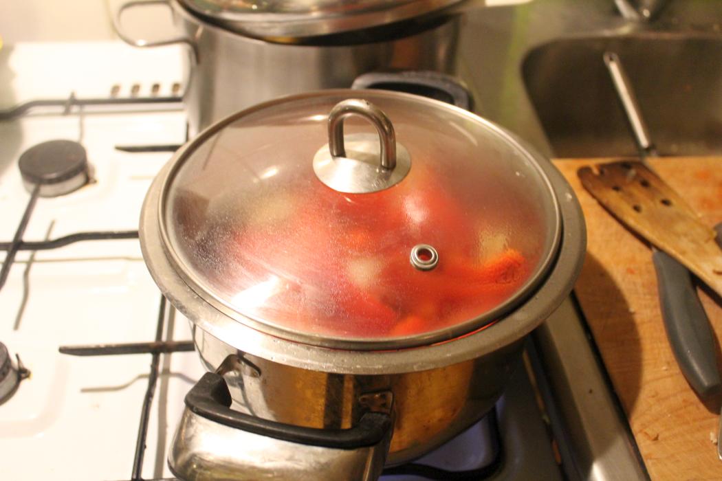 Ganz wichtig, auf mittlere Hitze runterdrehen und den Deckel auf den Topf legen. Paprika 30 Minuten schmoren lassen. Wenn das zu heftig kocht, noch weiter runterdrehen.