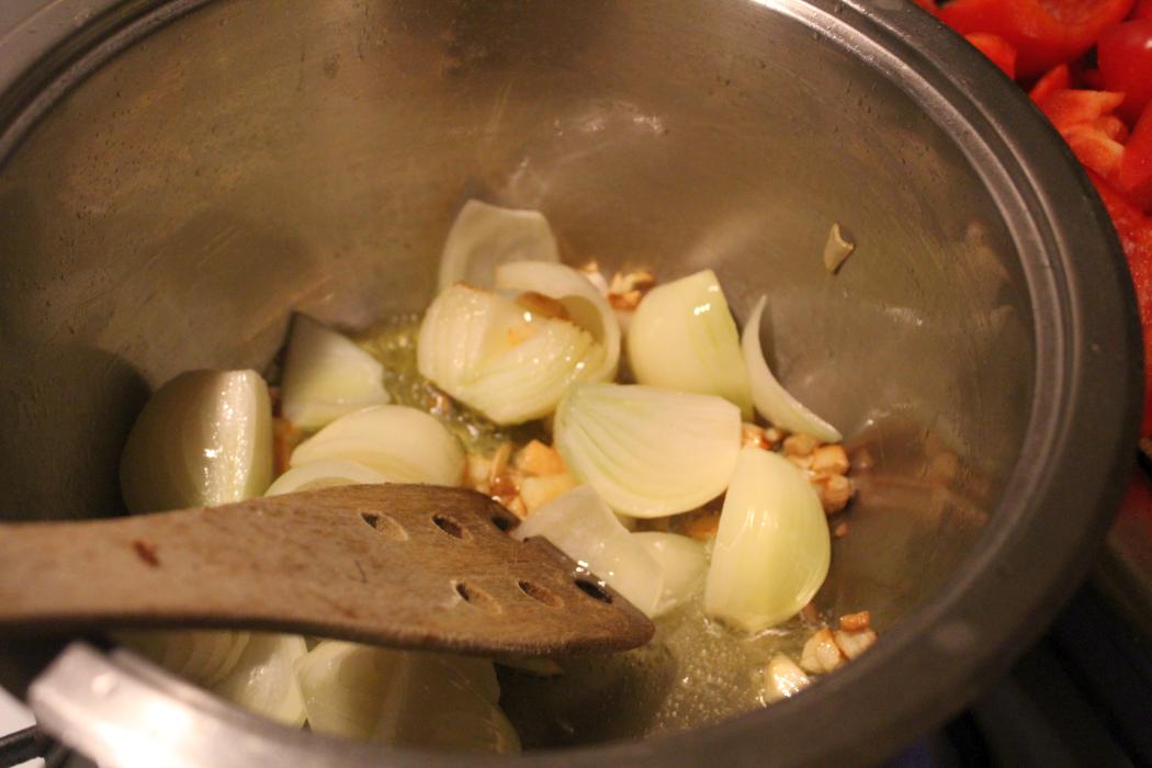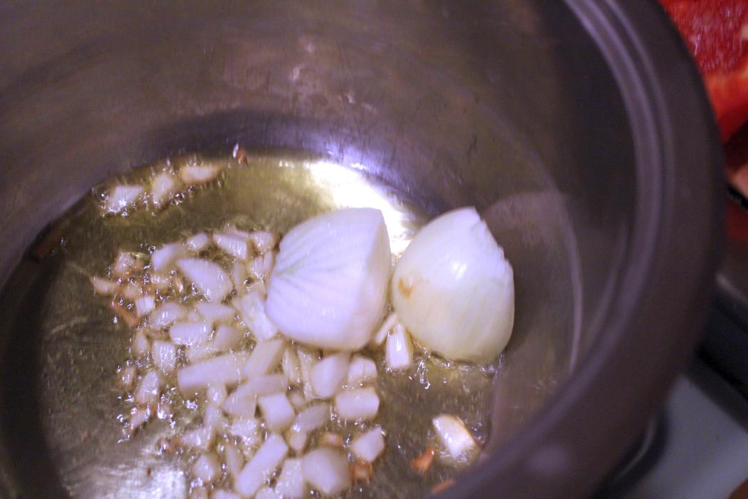 Fünf Zwiebeln zerkleinern, vierteln reicht.