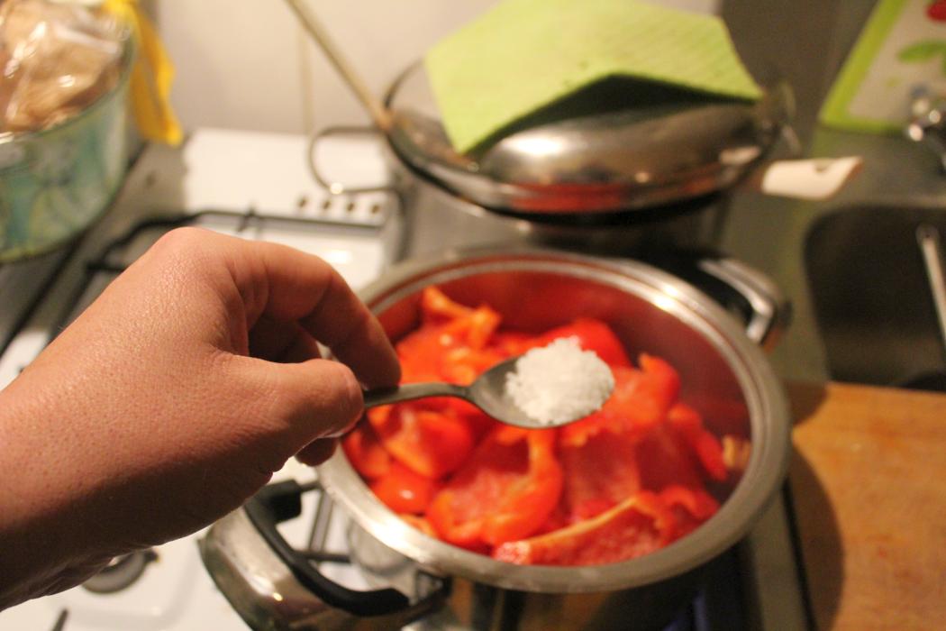 1 Esslöffel Meersalz und die Paprikaviertel in den Topf geben.