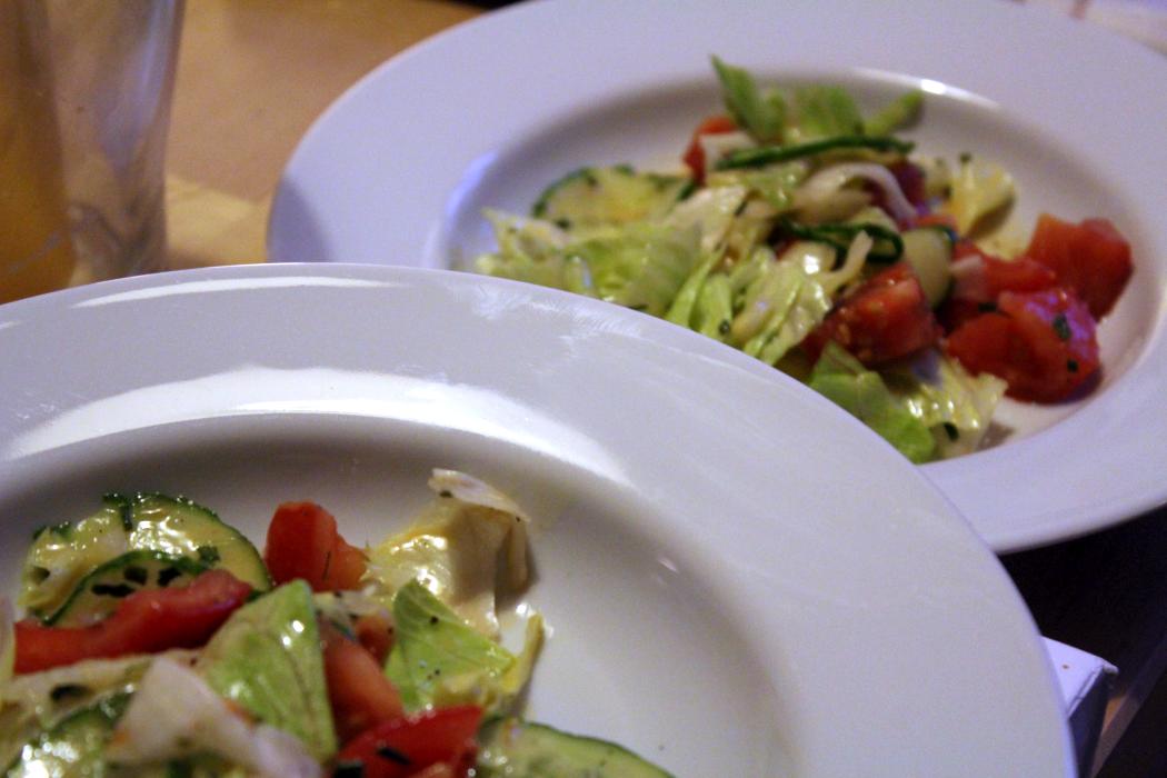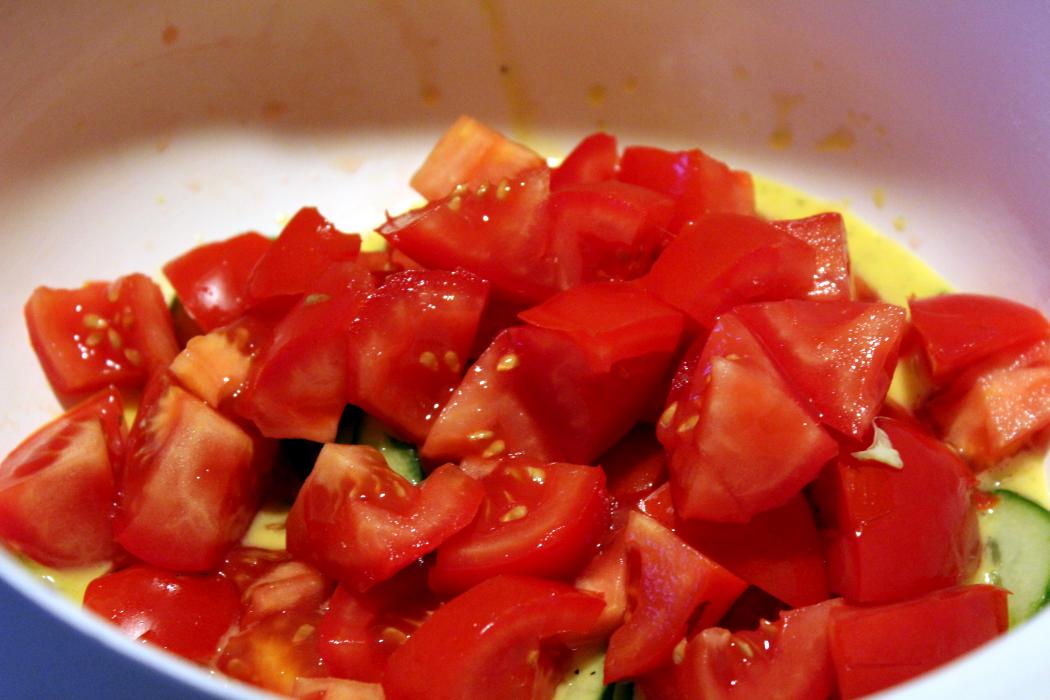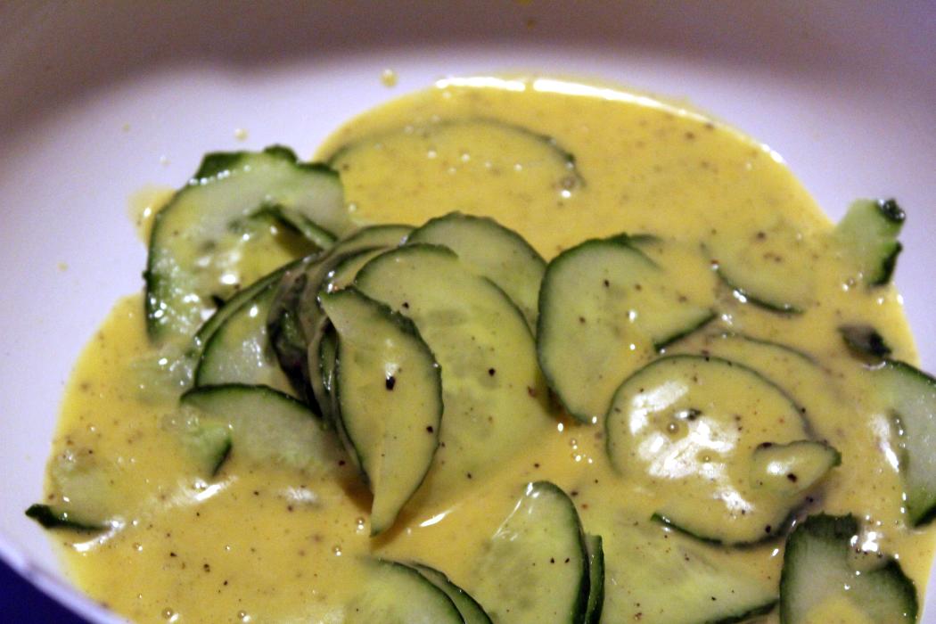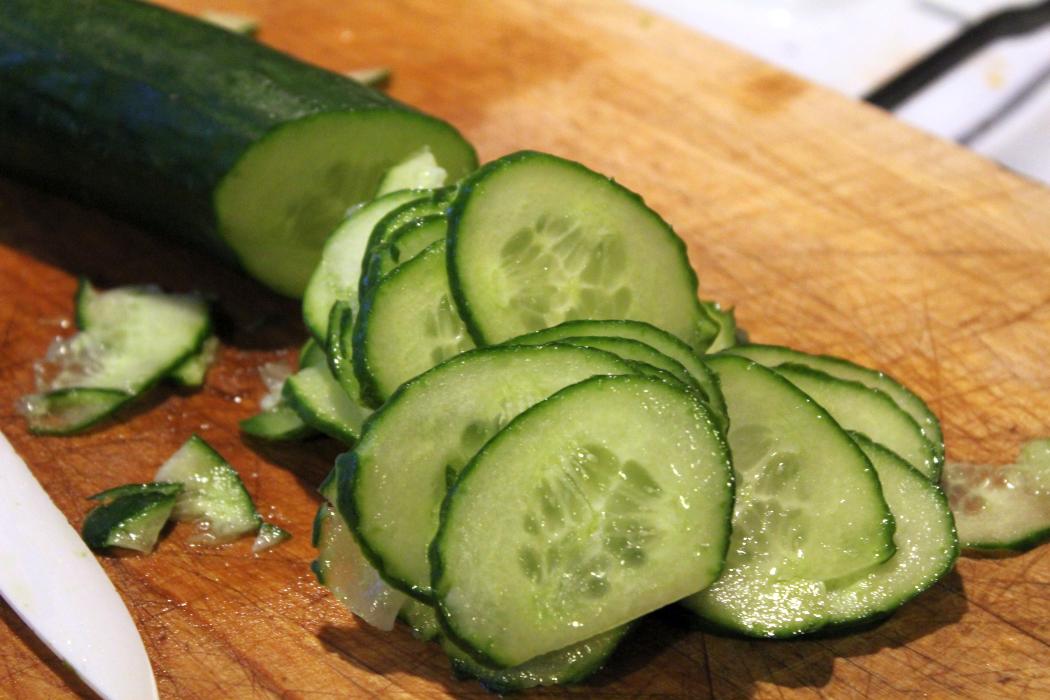Gurkenscheiben ins Salatdressing legen. Die können das ganz gut vertragen, wenn sie einen Moment marinieren.