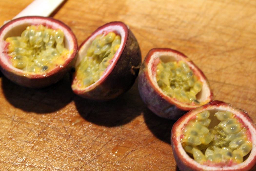 Passionsfrucht halbieren und den Inhalt mit einem Teelöffel entnehmen
